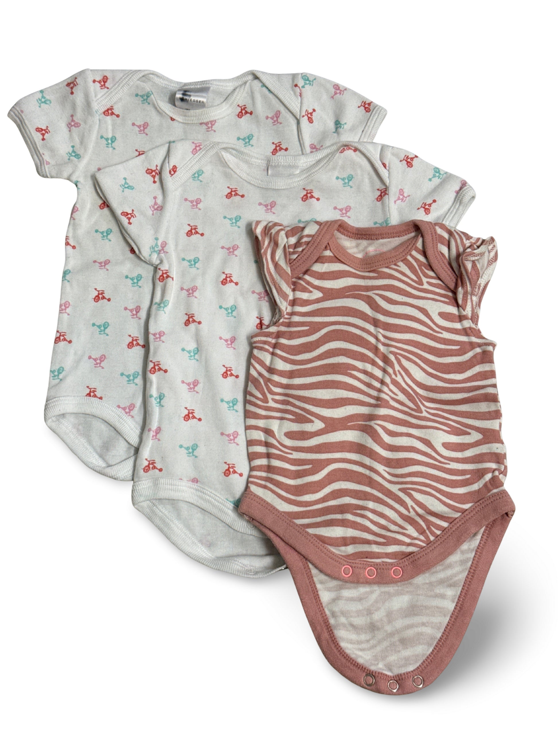 Set mit drei niedlichen Babybodys in zarten Pastelltönen und einem Rosa-Zebramuster. Zwei Bodys sind weiss mit kleinen bunten Dreirad-Motiven, der dritte zeigt ein stylisches Zebramuster und alle haben praktische Druckknöpfe im Schritt.