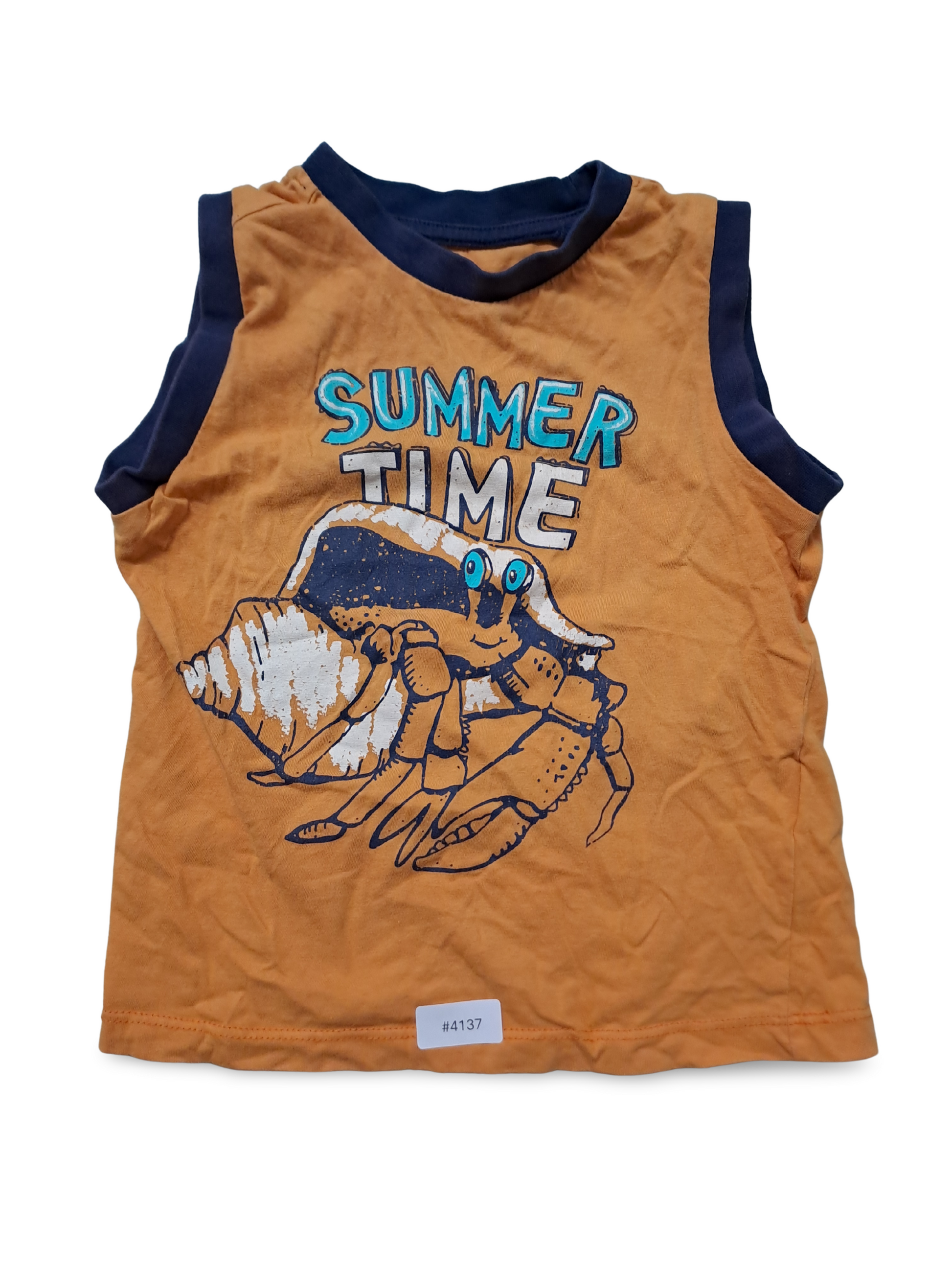 Ein sonniges, fröhliches Ärmelloses Shirt in kräftigem Orange mit einem verspielten Krebsmotiv und dunkelblauen Kontrastkanten. Es strahlt sommerliche Leichtigkeit aus, weckt Abenteuerlust am Strand und begleitet kleine Entdecker mit viel Charme.