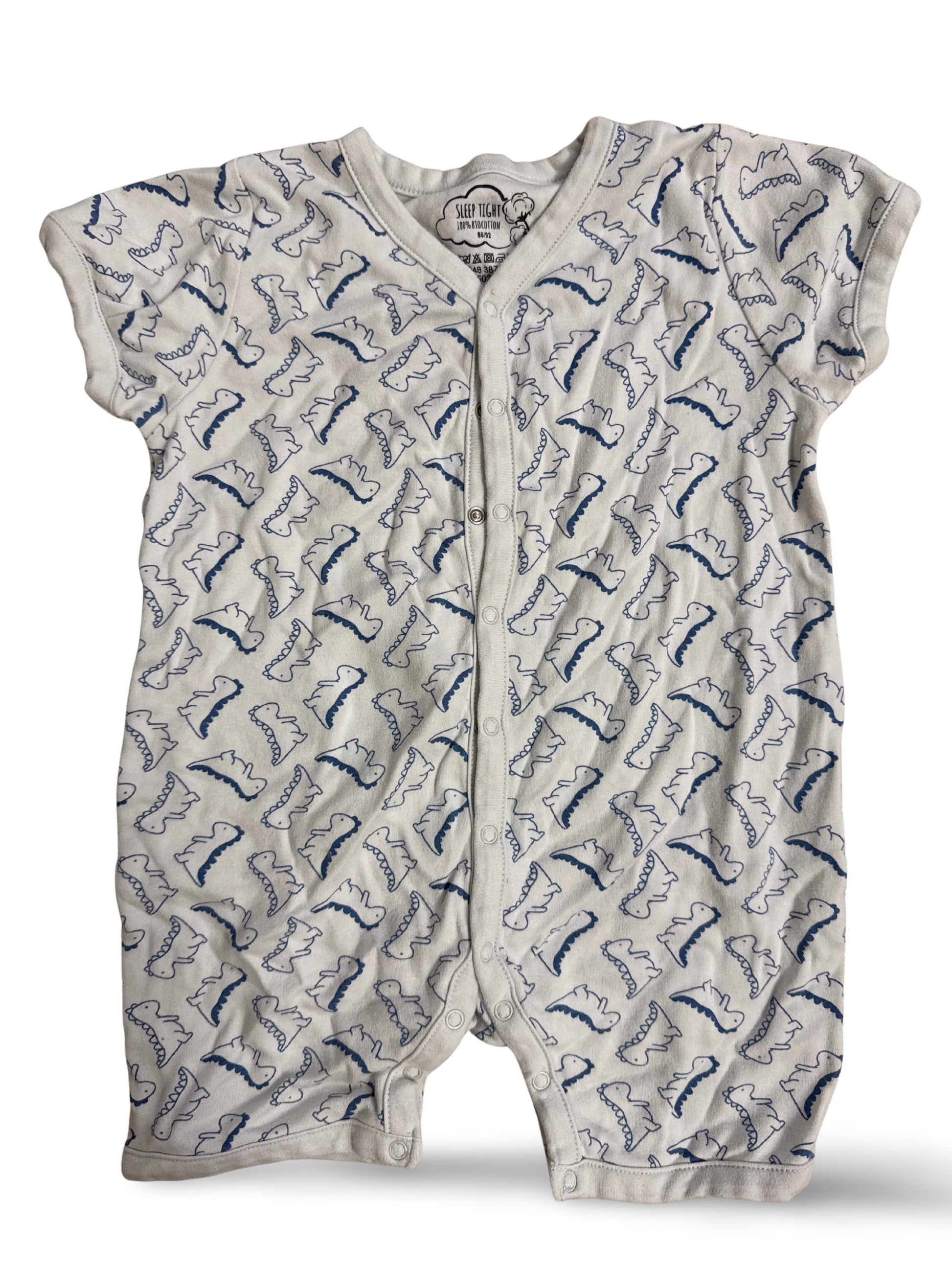 Niedlicher Kurzarm-Strampler mit blauem Dino-Allover-Print auf weissem Grund. Druckknopfleiste vorne und zwischen den Beinen ermöglicht einfaches An- und Ausziehen. Leichter, angenehmer Stoff — ideal für Sommer und Schlafenszeit.