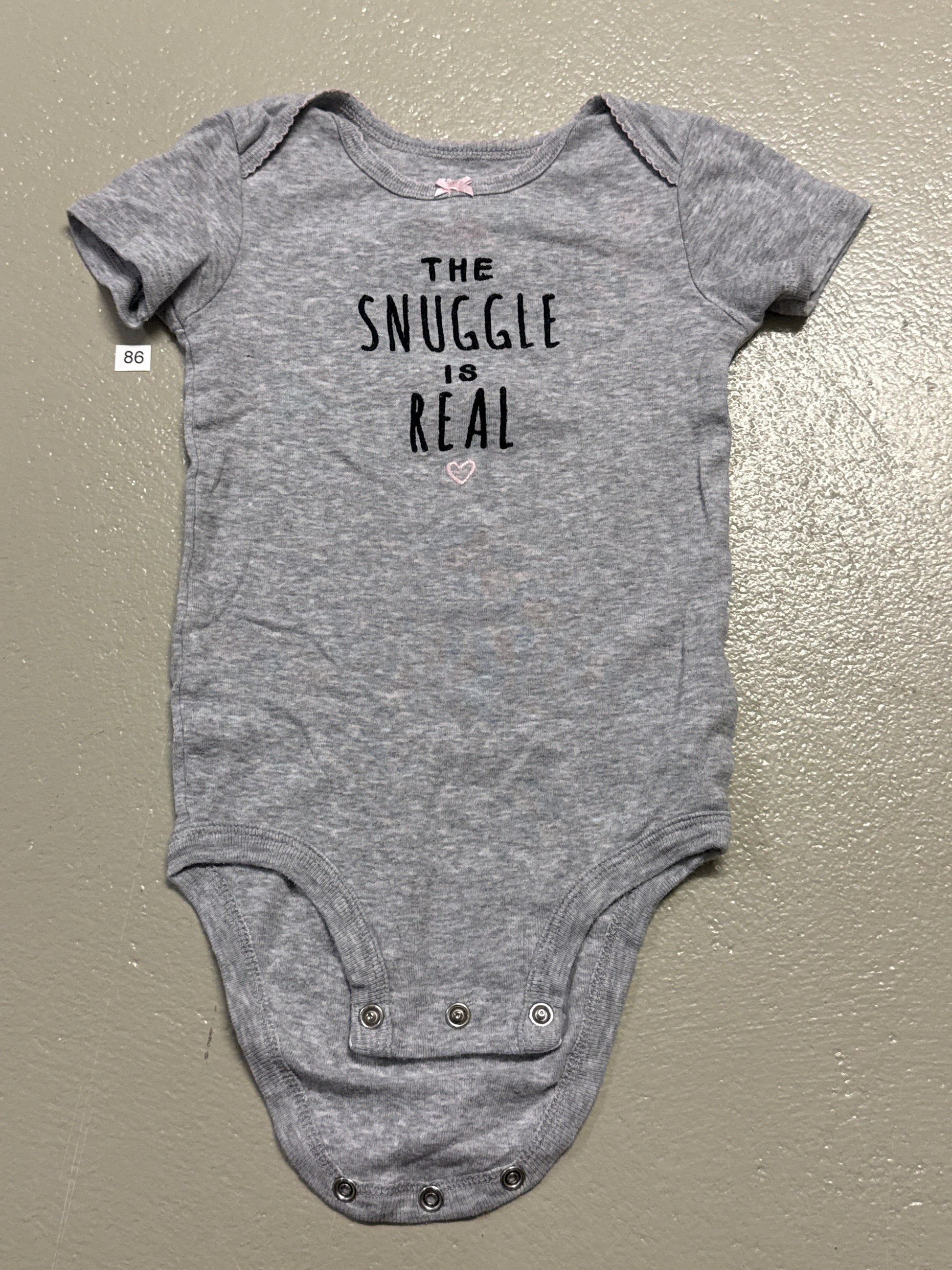 Ein grauer Body mit dem Aufdruck 'THE SNUGGLE IS REAL'.