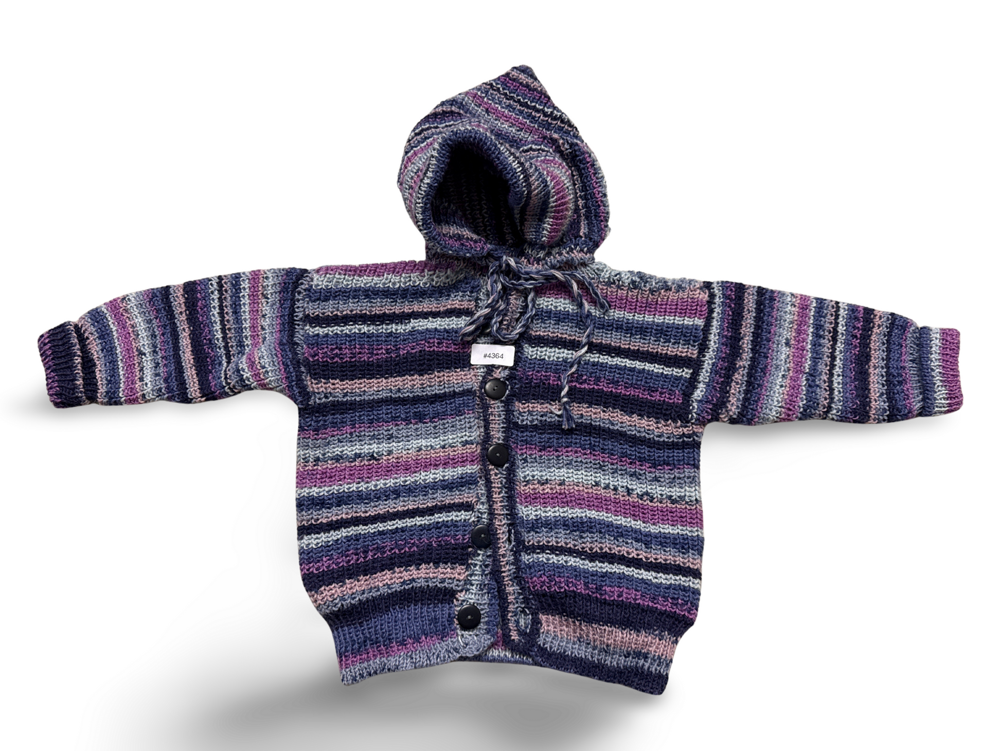 Handgestrickte Kinderjacke mit Kapuze in fröhlichen Streifen. Sie umarmt kleine Entdecker mit weicher Wärme und bringt Farbe in jeden Tag. Ein liebenswerter Begleiter für kuschelige Abenteuer.