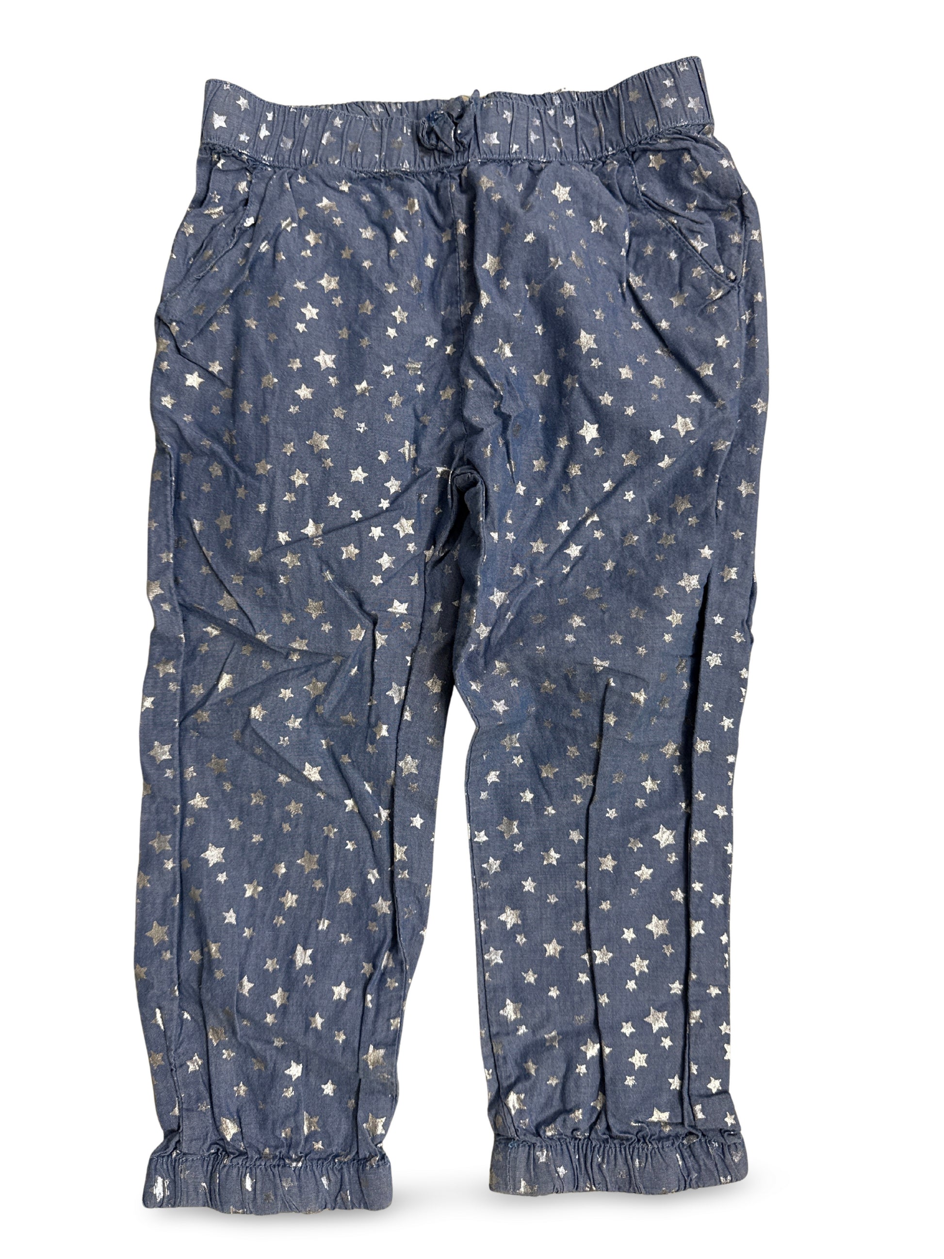 Dunkelblaue Stoffhose im Jeanslook mit elastischem Bund. Verspieltes silbernes Sternenmuster, seitliche Taschen und elastische Bündchen am Saum. Lässiges Teil, das sich vielseitig kombinieren lässt.