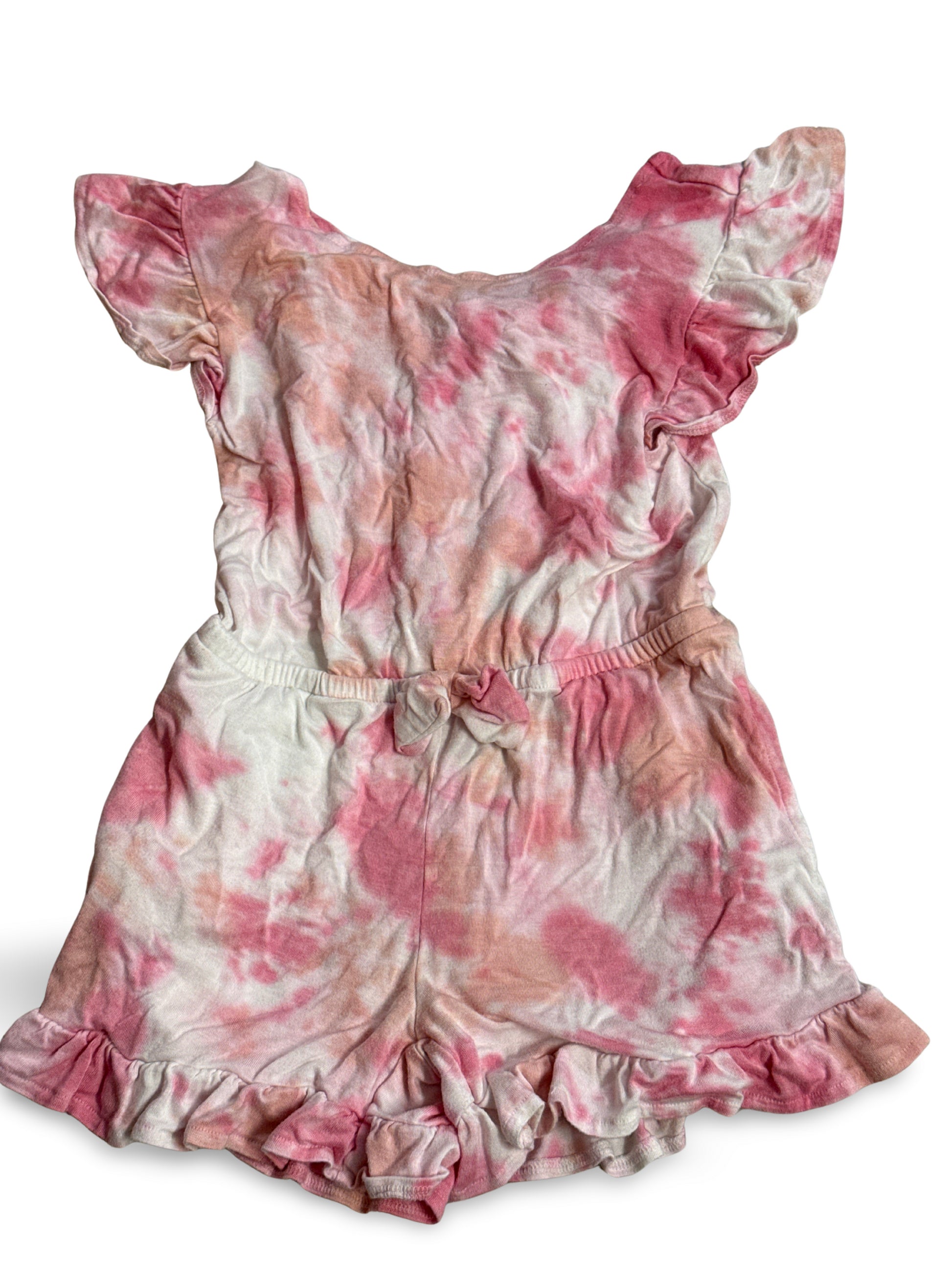 Niedlicher Kurzeinteiler im Tie‑Dye‑Look in zarten Rosa‑ und Pfirsichtönen. Verspielte Rüschen an Ärmeln und Saum sowie eine kleine Schleife in der Taille sorgen für charmante Details. Ideal für warme Tage und lässige Sommeroutfits.