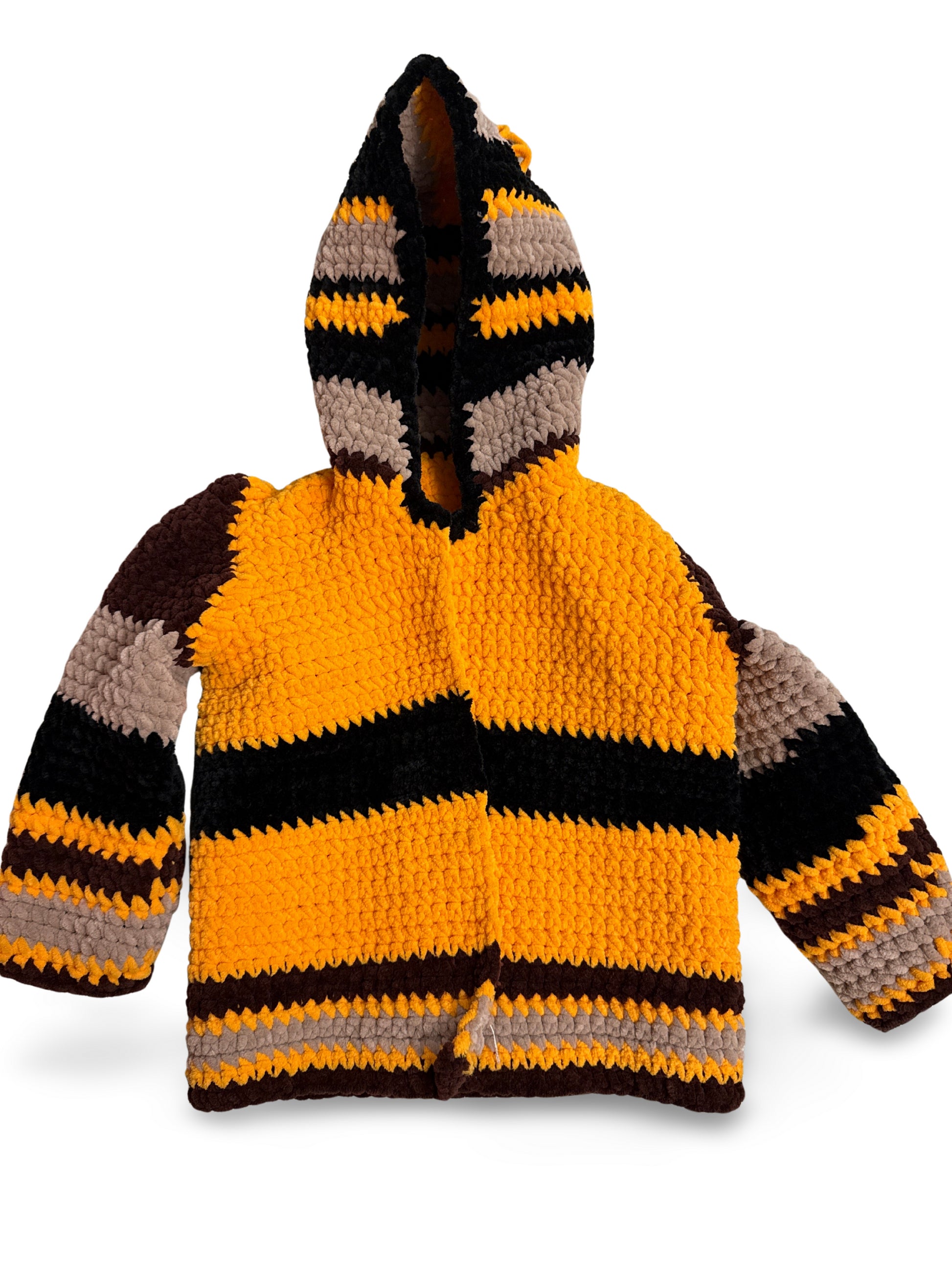 Gehäkelte Kapuzenjacke mit markanten Streifen in Gelb, Schwarz, Braun und Beige. Die grobe Struktur und das weiche Garn sorgen für ein kuscheliges Tragegefühl und einen retro-inspirierten Look.