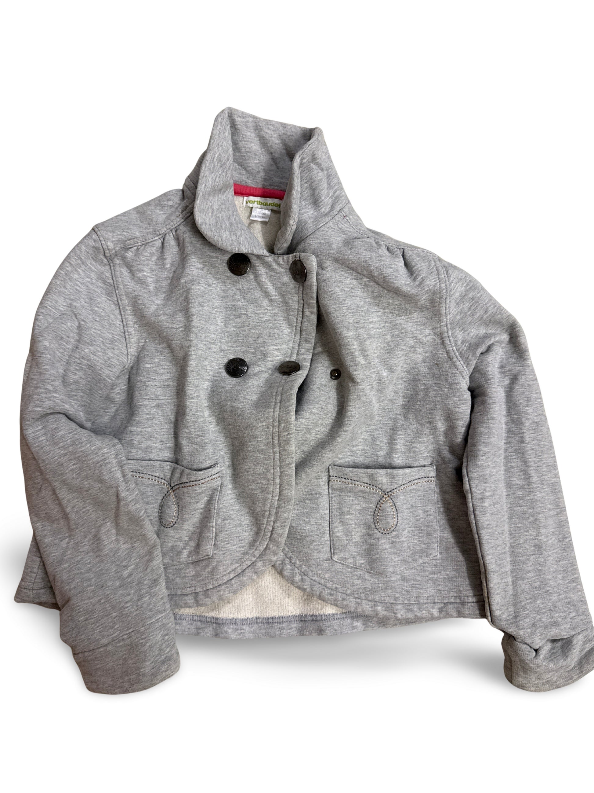 Leichte, kurz geschnittene Jacke aus weichem Sweatstoff in hellem Grau mit hohem Stehkragen und doppelreihiger Knopfleiste. Ziernähte an den aufgesetzten Taschen und der abgerundete Saum sorgen für feminine Details und einen lässigen Alltagslook.