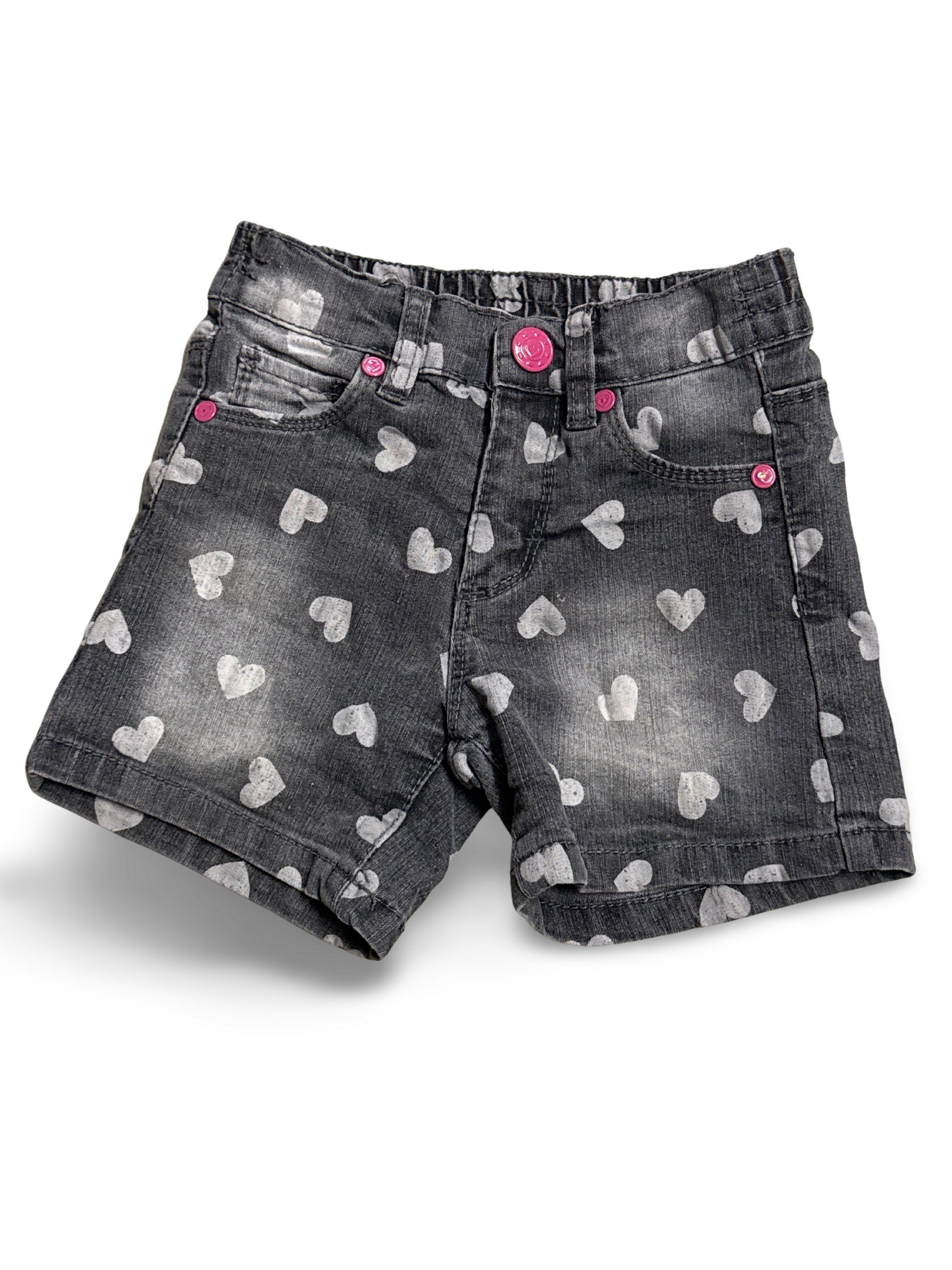 Dunkle Jeans-Shorts in Denimoptik mit weissen Herzchen und pinken Knöpfen. Mit elastischem Bund und praktischen Taschen – ein verspieltes Sommerteil fürs Kinderoutfit.