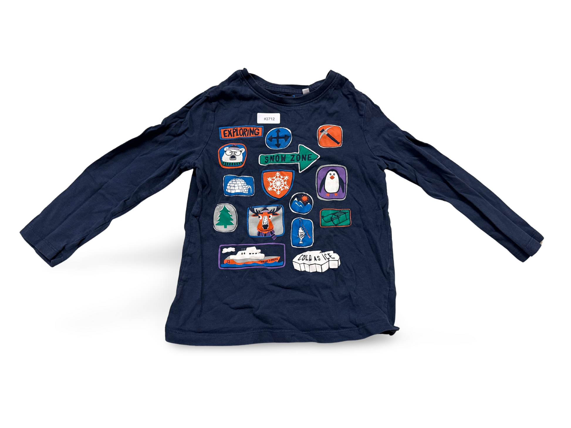 A loosely fitting long-sleeved shirt for little explorers, featuring colorful winter patches like a penguin, igloo, snowflake, and reindeer. A cheerful, child-friendly design that invites play and wonder.