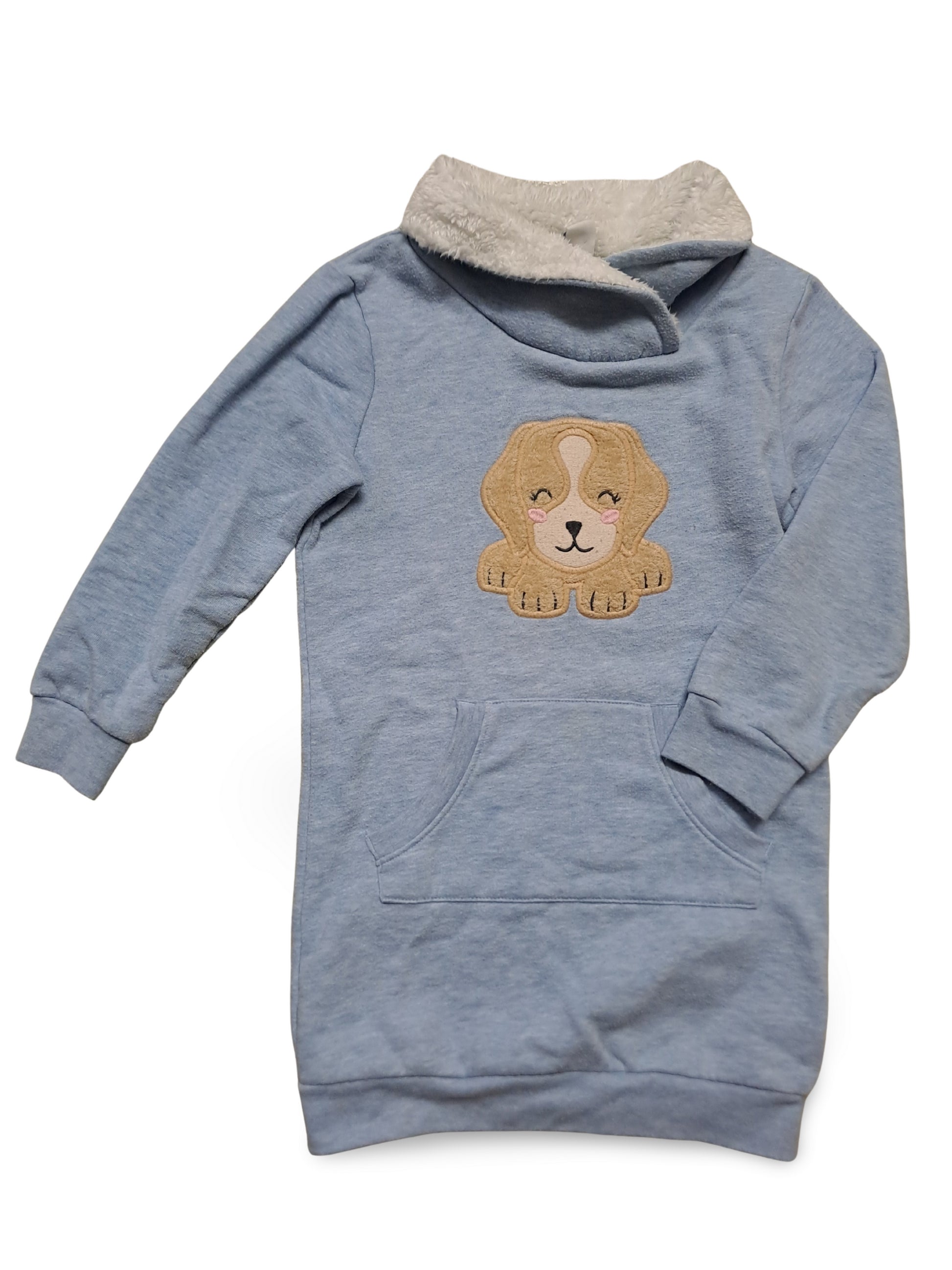 Hellblaues Hoodie-Kleid mit weichem, hellbeigem Teddykragen und grosser Kängurutasche vorn. Auf der Brust prangt ein süsses Hundemotiv, das dem Teil einen verspielten Charakter verleiht. Rippbündchen an Ärmeln und Saum sorgen für Komfort und einen lässigen Look.