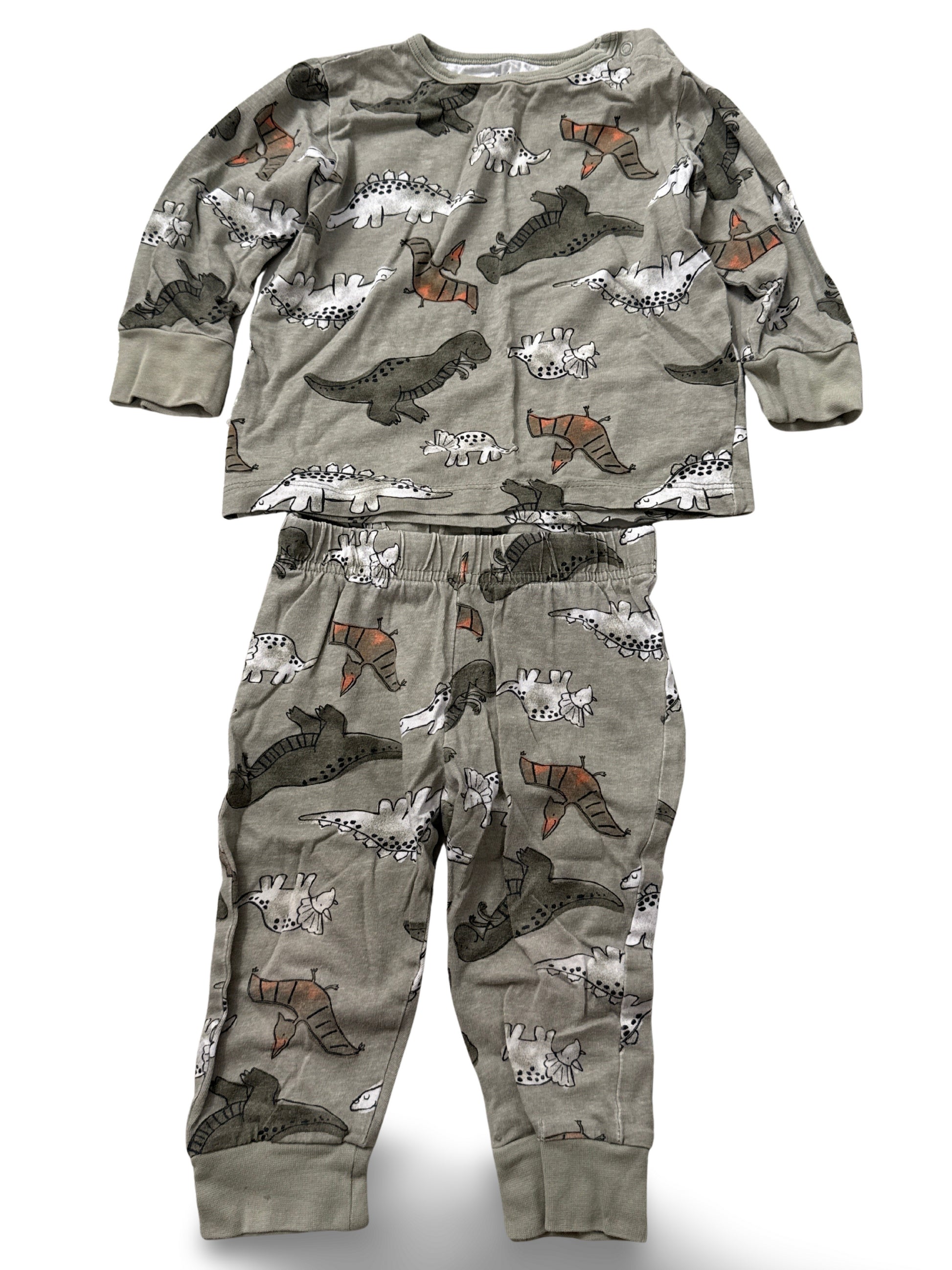 Niedliches Pyjama-Set mit witzigem Dinosaurier-Print in dezenten Grün- und Erdtönen. Das Set besteht aus langärmeligem Oberteil und gemütlicher Hose mit elastischem Bund — ideal für kleine Dino-Fans.