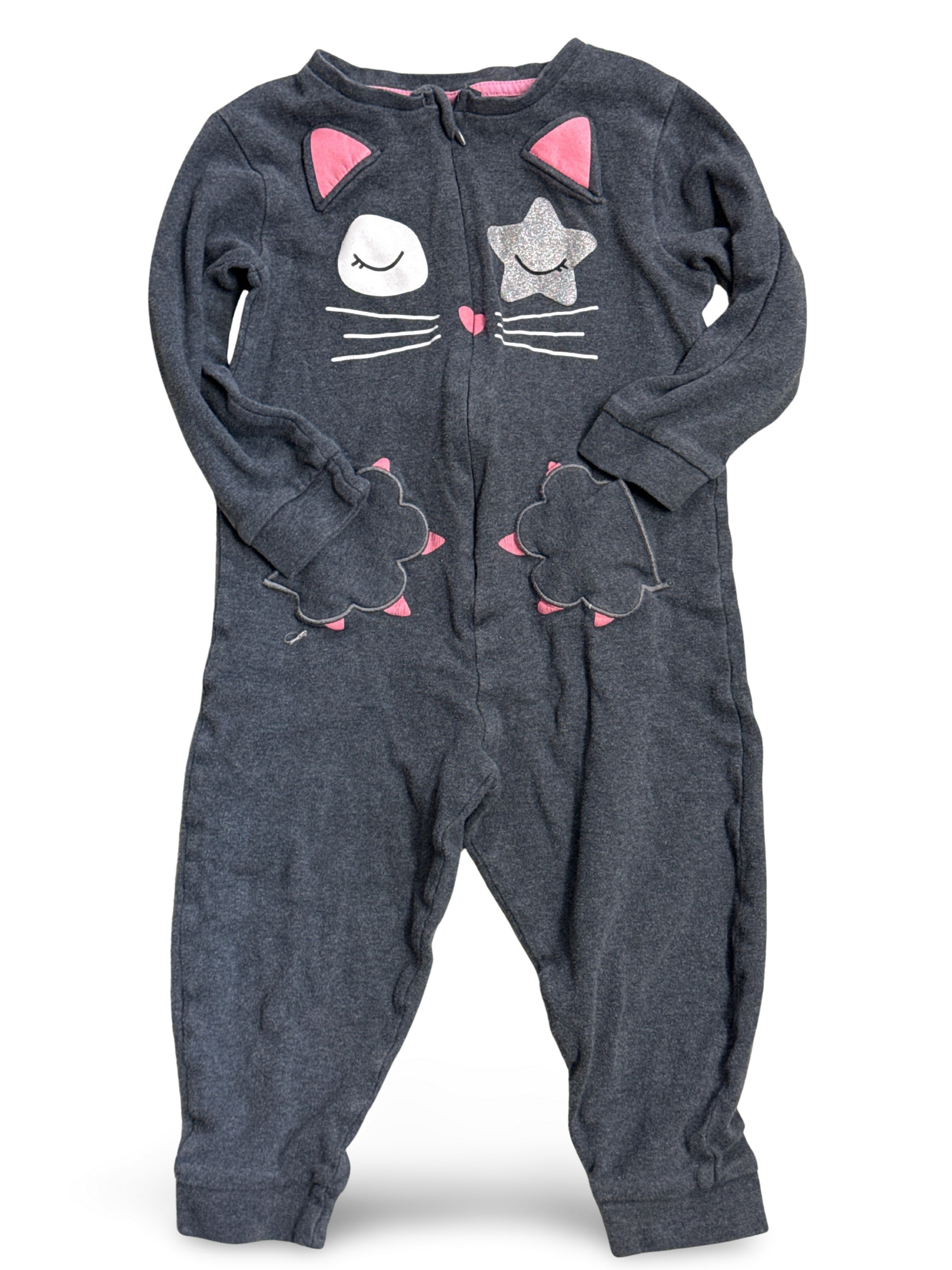 Dunkelgrauer Kinder-Einteiler mit praktischem Reissverschluss vorne und niedlichem Katzenmotiv, ergänzt durch applizierte Öhrchen und ein glitzerndes Sternchen als Auge. Verspielte Wolkentaschen mit pinken Akzenten machen das Design besonders charmant.