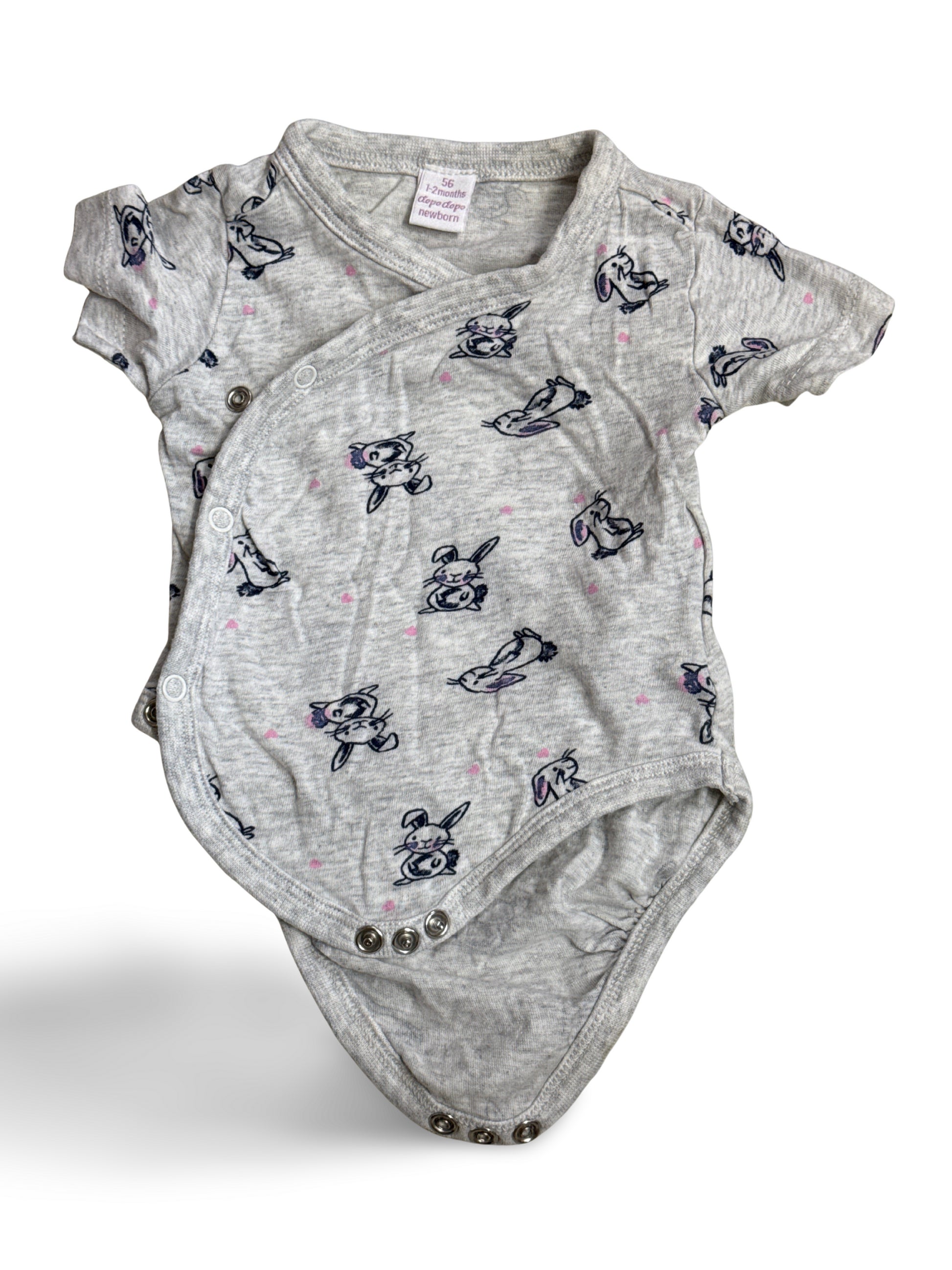 Grauer Wickelbody mit süssem Hasenmuster, ideal für den Alltag. Mit kurzen Ärmeln und praktischer Druckknopfleiste seitlich und im Schritt für einfaches An- und Ausziehen. Weicher Jersey sorgt für angenehmen Tragekomfort.