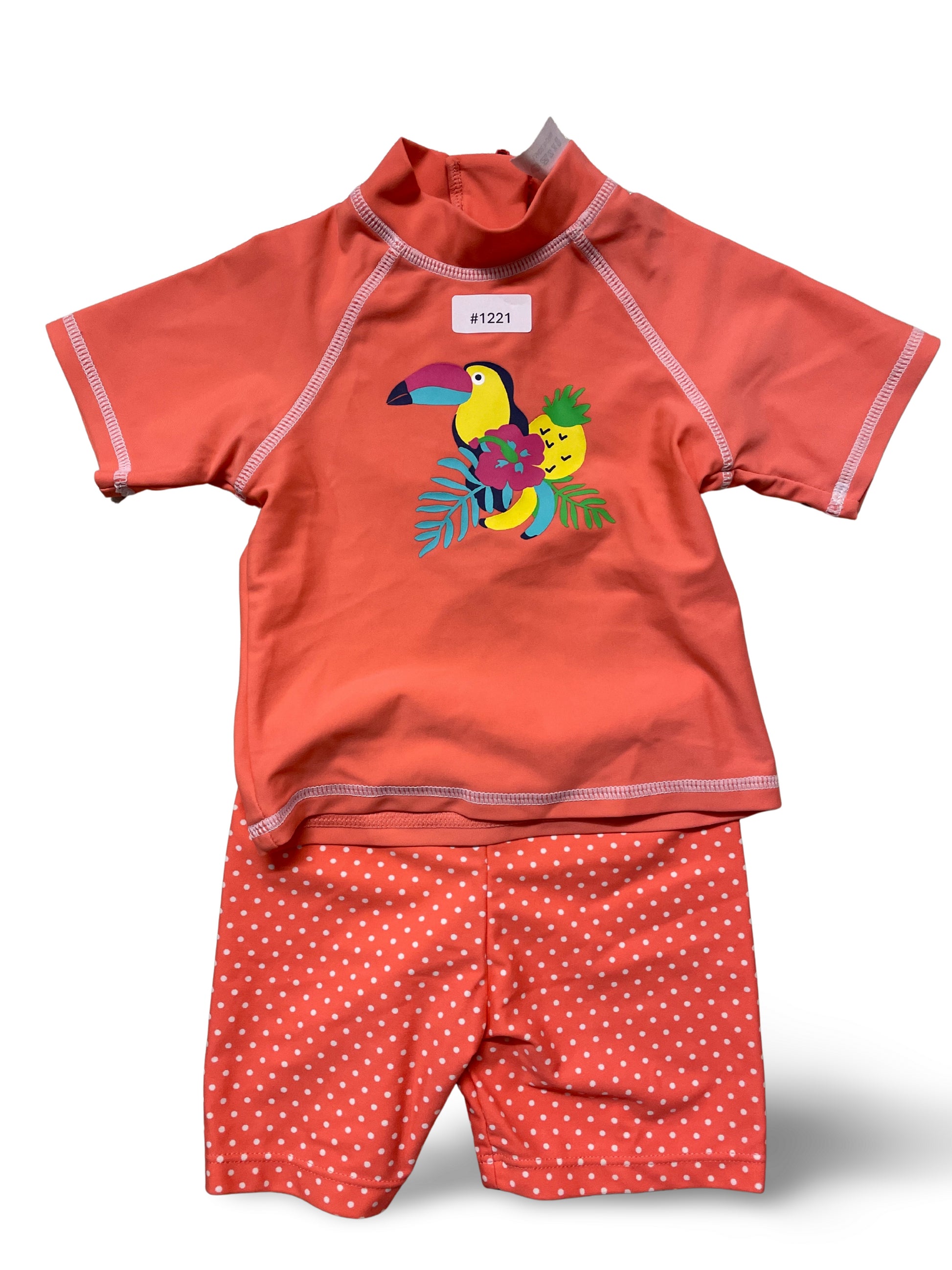 Badeset bestehend aus einem T-Shirt mit buntem Toucan-Motiv und einer passenden Hose mit Punkten.