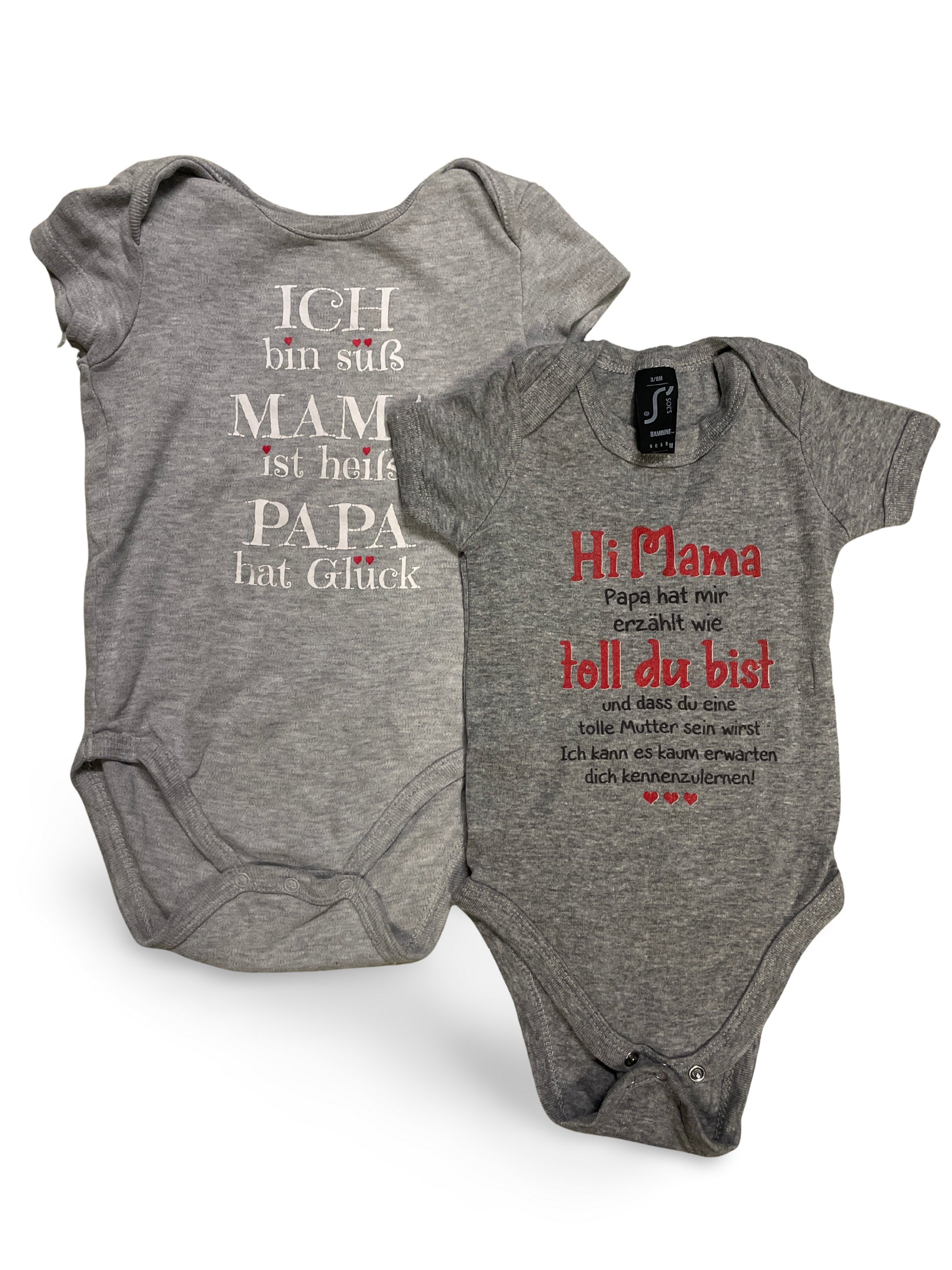 Zwei grau melierte Baby-Bodys mit süssen Schriftzügen auf der Vorderseite – einmal weiss bedruckt, einmal mit rotem und schwarzem Schriftzug. Schlichte, zeitlose Optik, ideal für den Alltag oder als Geschenk.