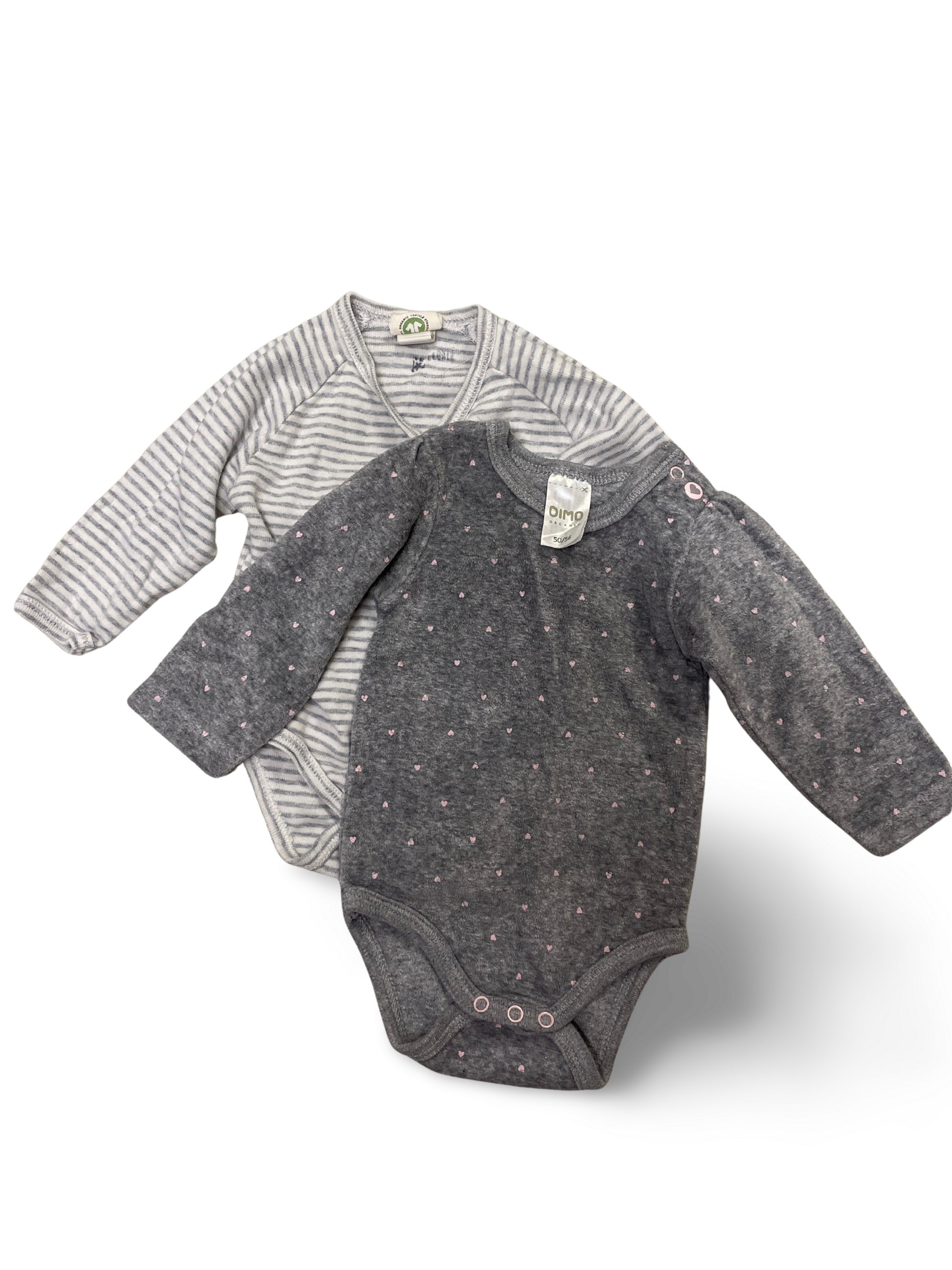 Charmantes 2er-Set Langarm-Bodys in dezenten Grautönen: ein dunkelgraues Modell mit kleinen rosa Herzchen und ein hellgrau-weiss gestreiftes Exemplar. Mit praktischem Überlapp-Ausschnitt und Druckknöpfen im Schritt für einfaches An- und Ausziehen.