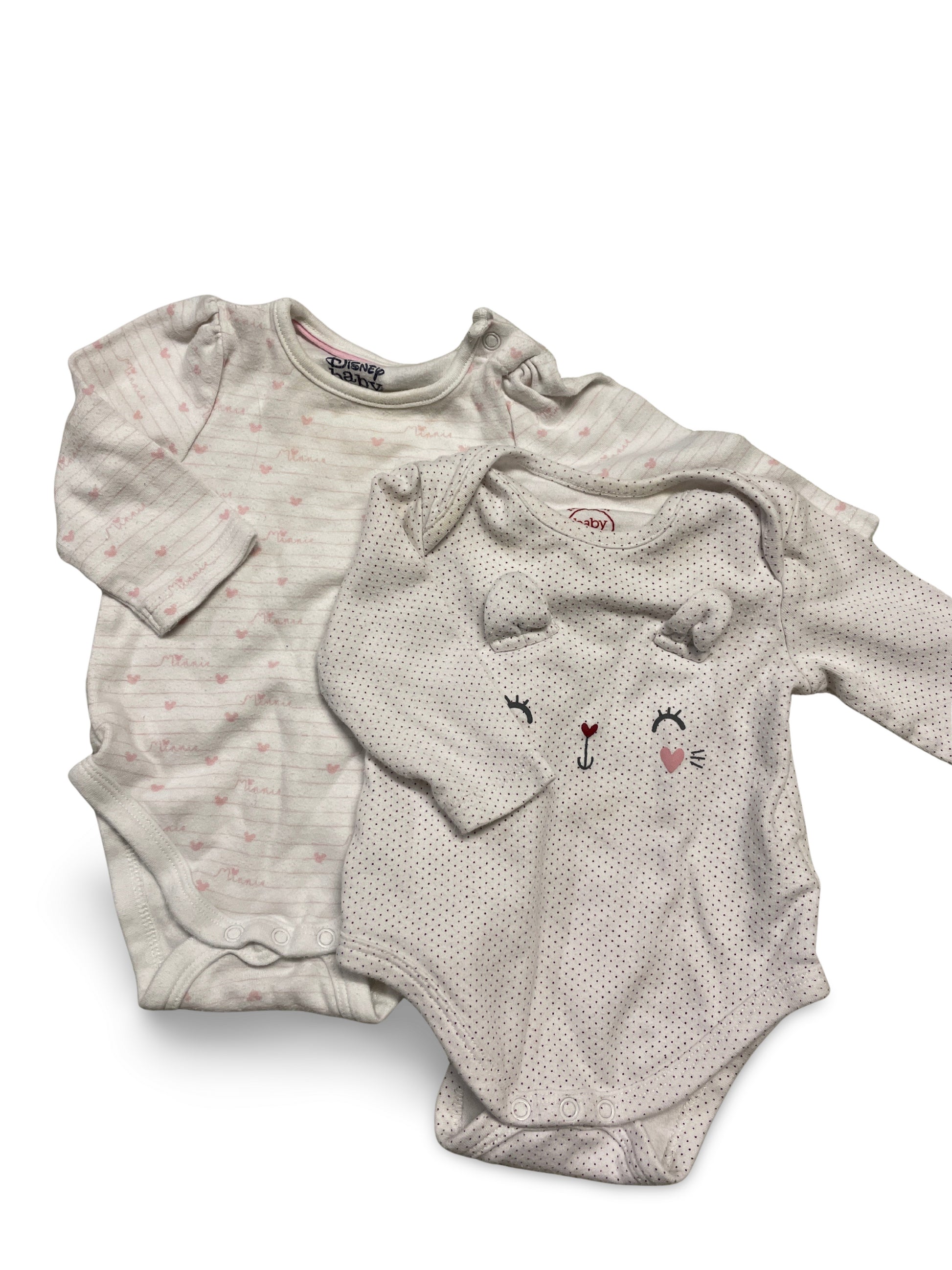 Zweier-Set langärmeliger Bodys in zarten Pastelltönen. Einer ist mit feinen Streifen und dezenten Herzchen bedruckt, der andere mit kleinen Punkten und süsser Tier-Gesichtsstickerei samt 3D-Öhrchen. Praktische Druckknöpfe am Schritt für einfaches Windelwechseln.