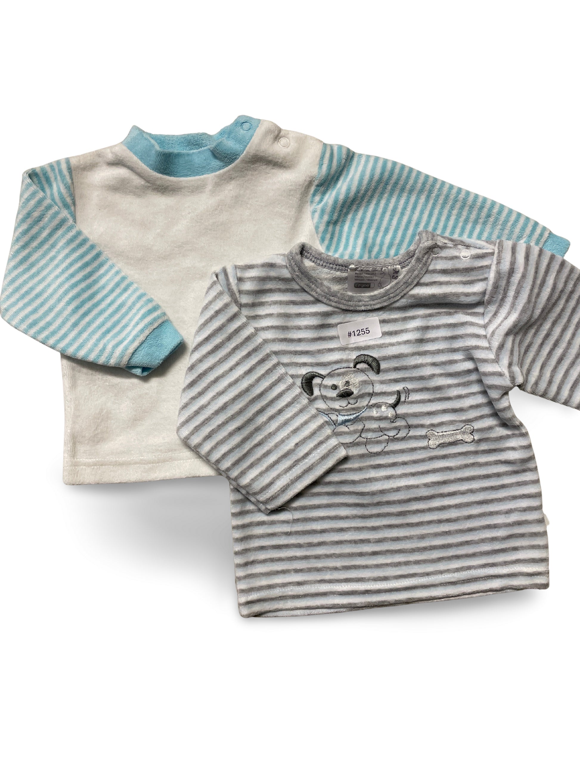 Zwei süße Langarmshirts für Babys, eines in Weiß mit blauen Streifen und das andere in Grau mit Streifen und Hundemotiv.