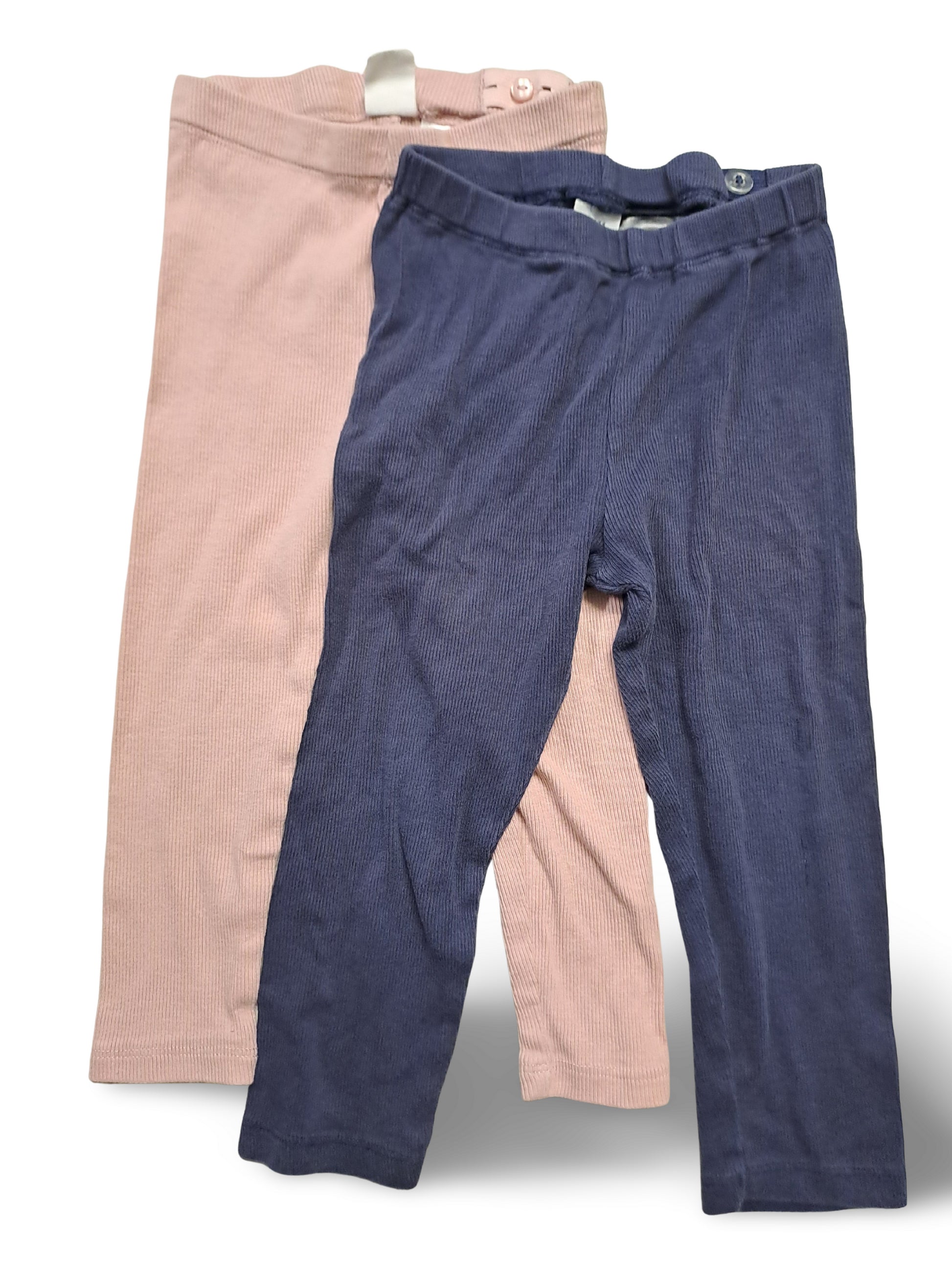 Set mit zwei Leggings in zartem Rosa und dunkelblau aus weichem Rippstoff mit elastischem Bund. Schlichtes, zeitloses Design, vielseitig kombinierbar. Ideal als täglicher Begleiter oder als zusätzliche Schicht unter Kleidern und Röcken.