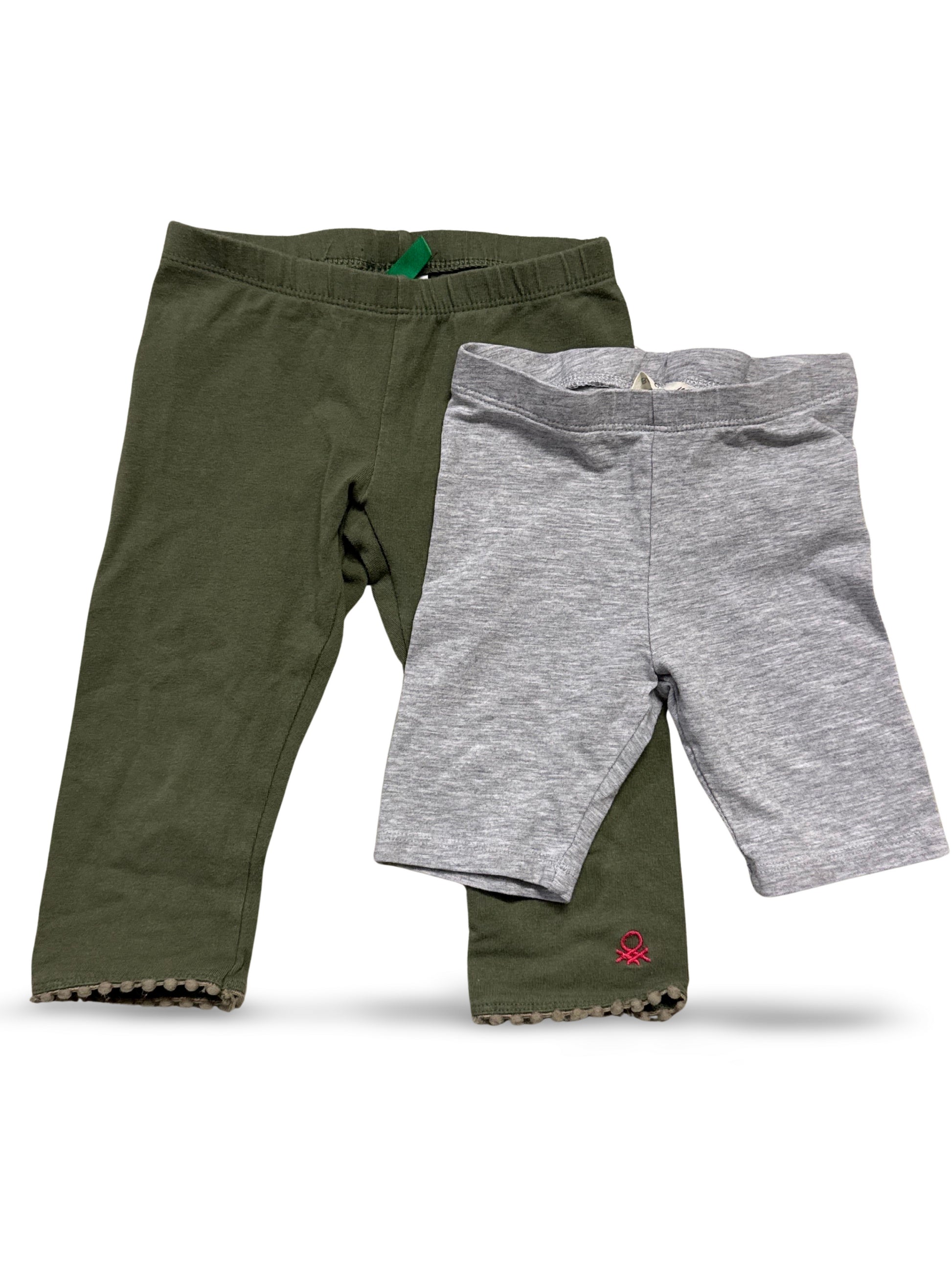 Zwei Leggings, eine in Olivgrün mit dekorativem Saum und eine in Grau mit kleiner Applikation.