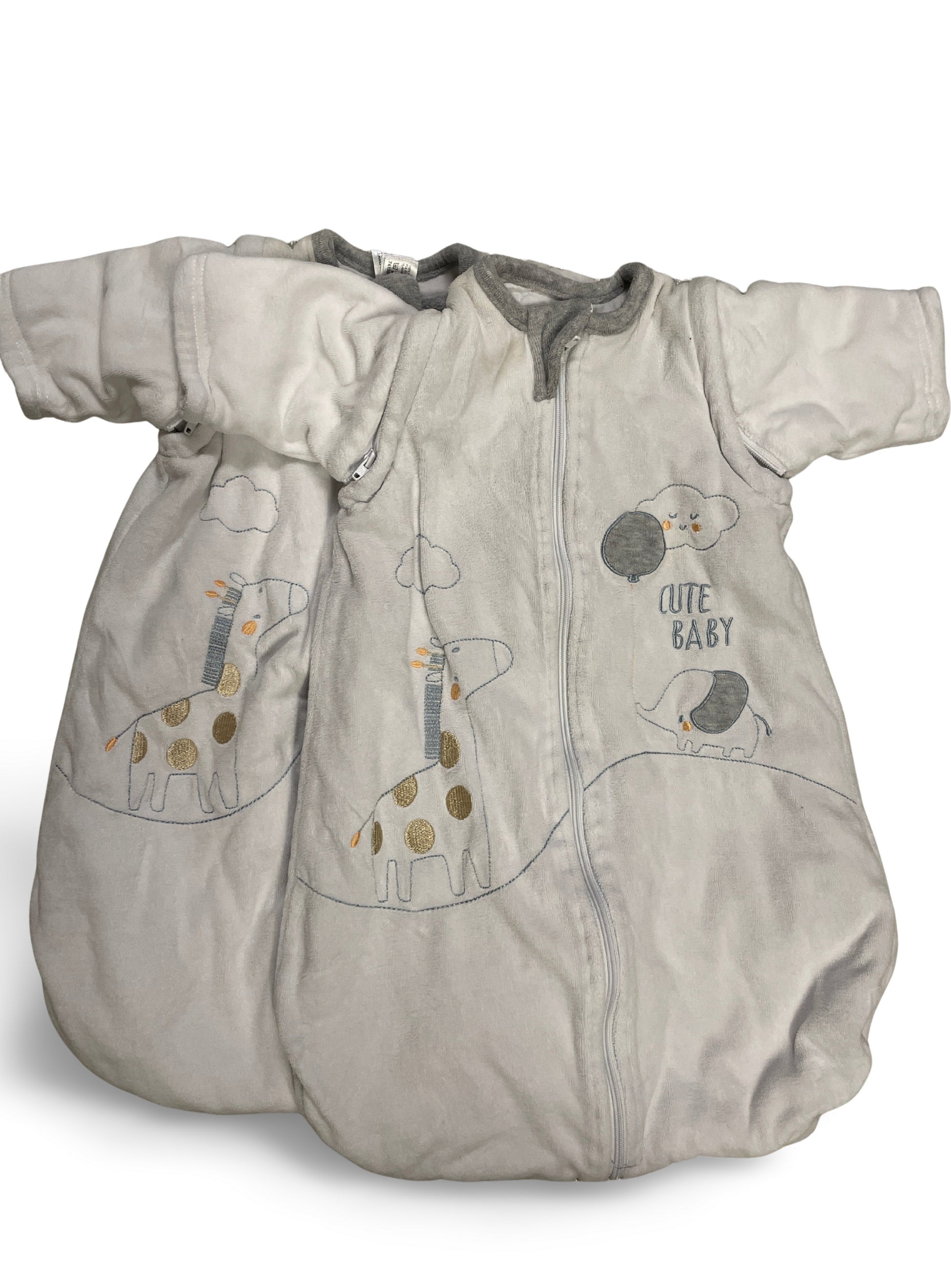 Beiger Babyschlafsack mit süssen Giraffen- und Elefanten-Applikationen sowie dezenter Wolken-Stickerei. Mit praktischem durchgehendem Reissverschluss für einfaches An- und Ausziehen. Neutraler Look und weiches Material, ideal für ruhige Nächte. Leichte Flecken