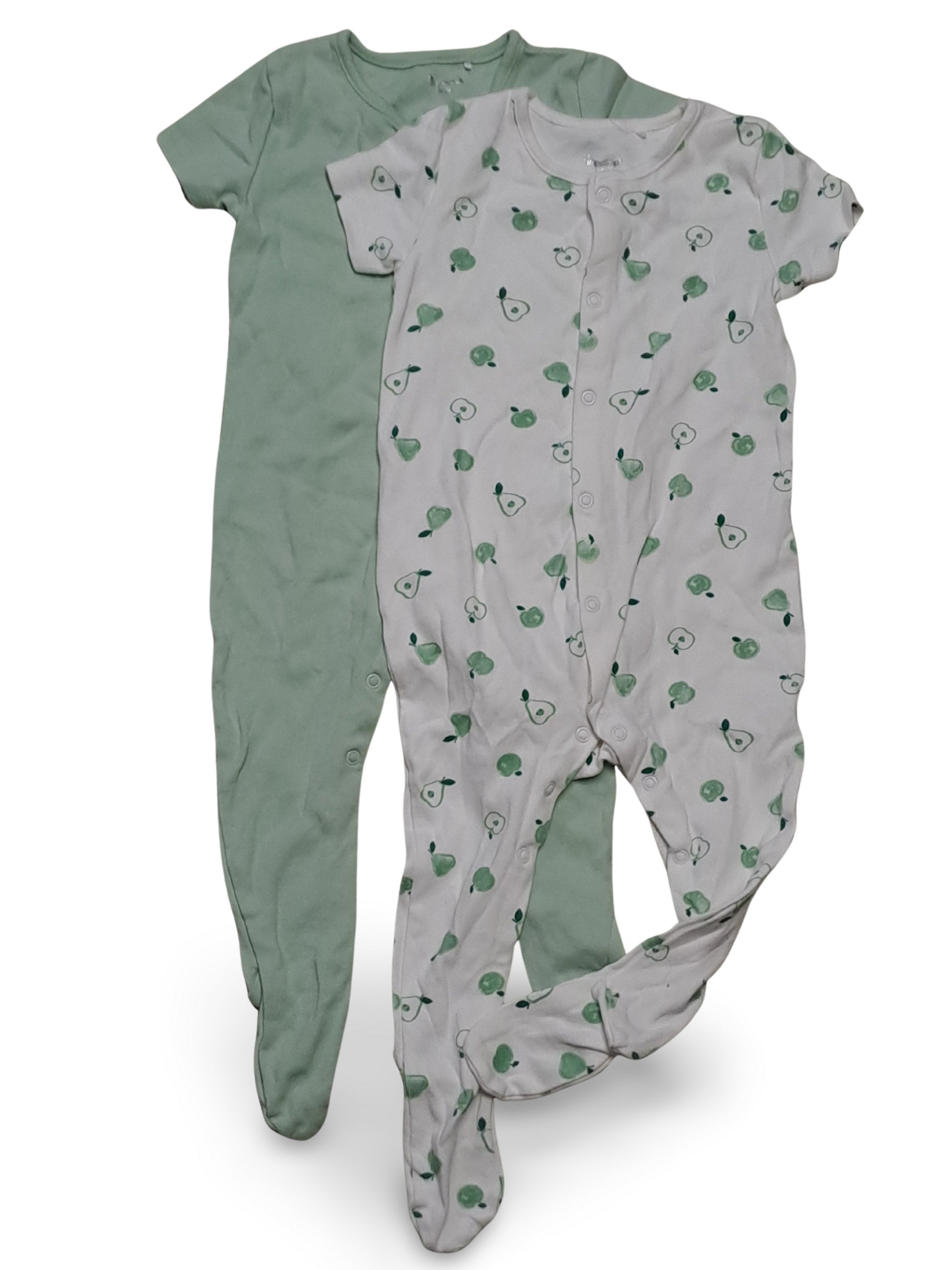 Zweier-Set Baby-Schlafanzüge mit Füsschen: ein schlichtes Mintgrün und ein weisses Modell mit dezentem Birnenmuster. Mit durchgehender Druckknopfleiste vorne für einfaches An- und Ausziehen und aus weichem, bequemem Material für gemütliche Nächte.