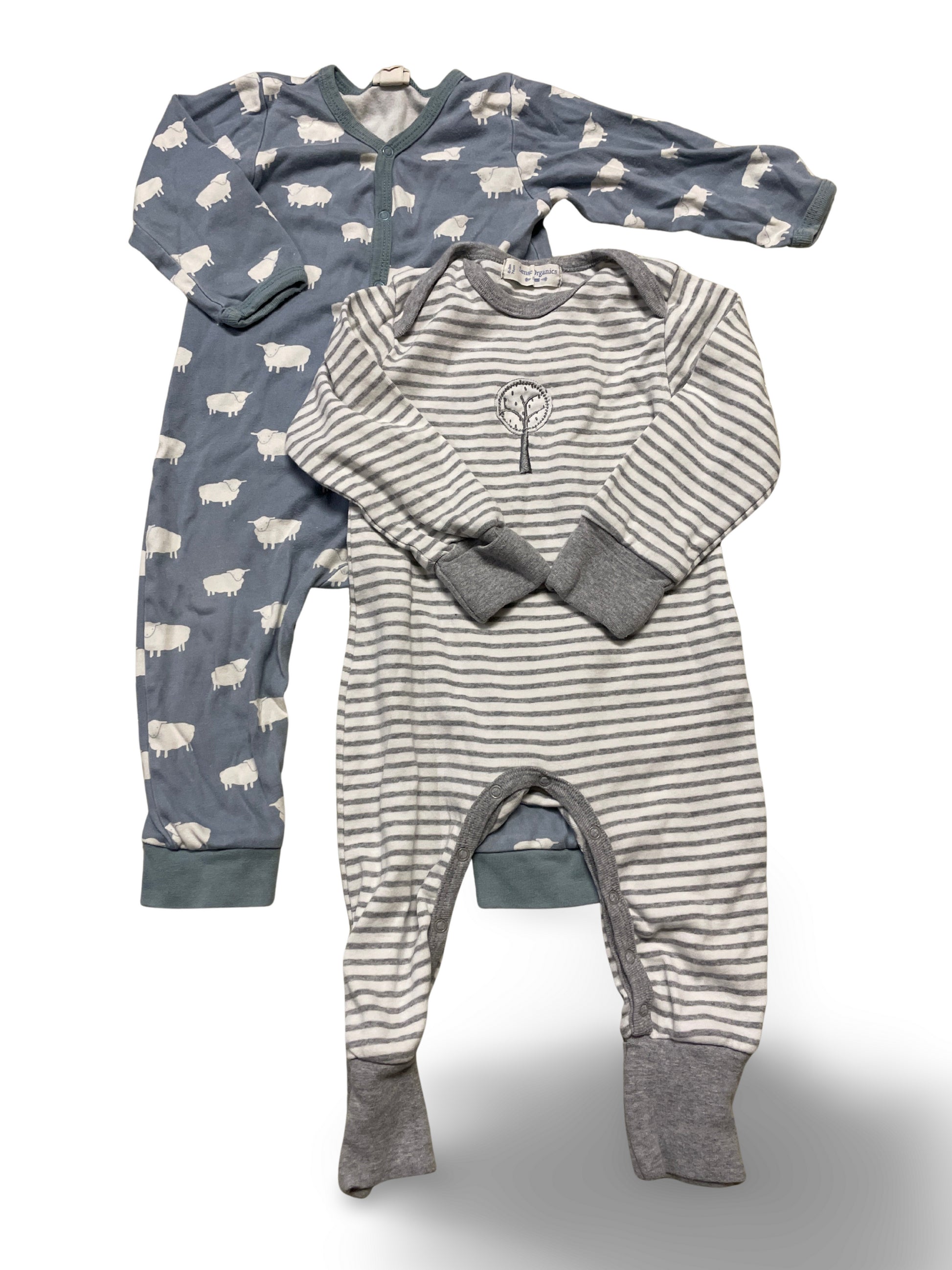 Zweier-Set mit langärmligen Stramplern in dezenten Blau- und Grautönen, eines mit niedlichem Schafmuster und eines mit feinen Streifen und kleinem Baum-Motiv. Aus weichem Baumwolljersey mit praktischer Druckknopfleiste am Schritt, ideal für gemütliche Tage und die Nacht.