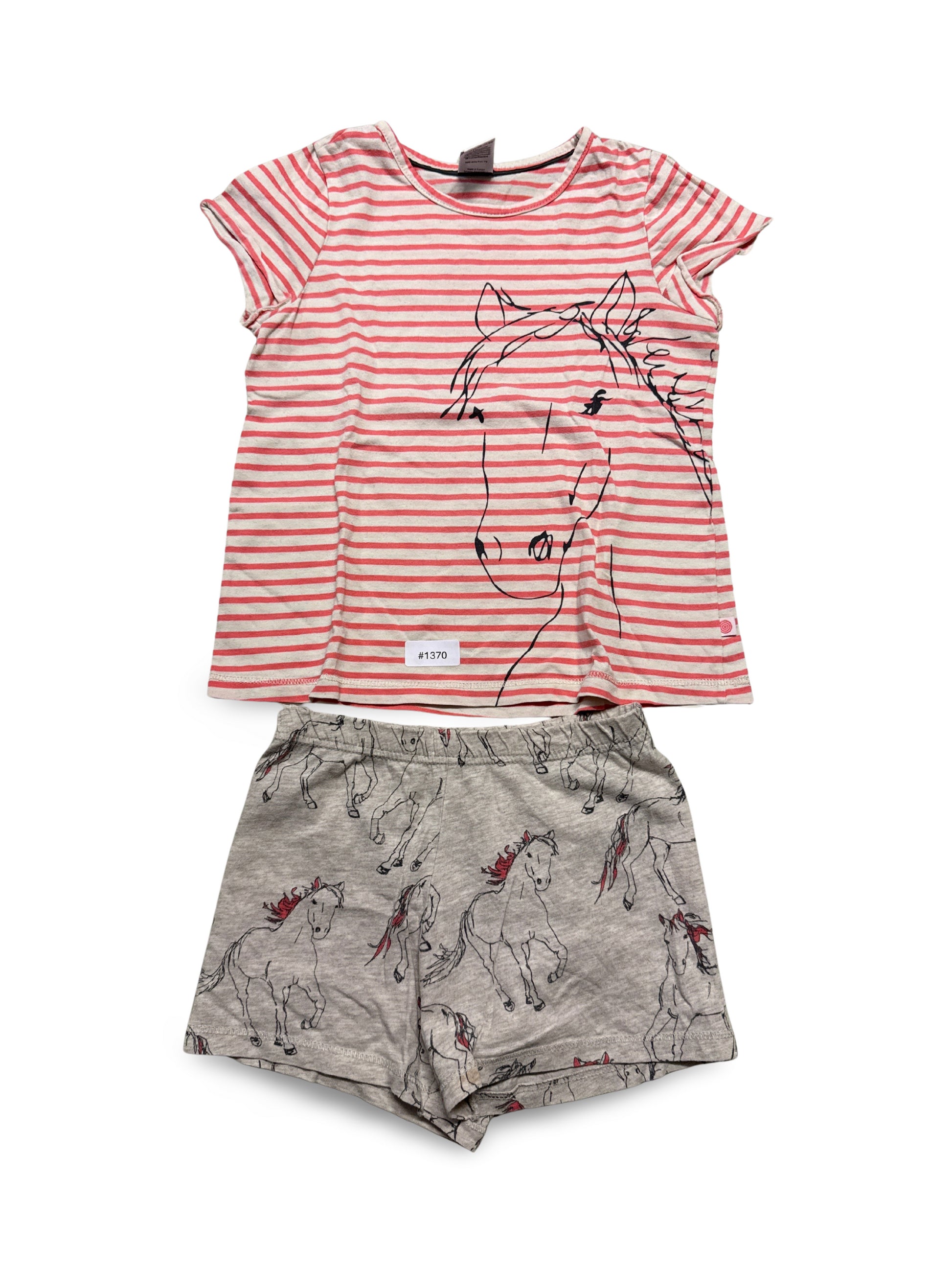 Ein süsses T-Shirt mit Streifen und einem Pferde-Motiv, kombiniert mit bequemen Shorts mit Pferdedruck.