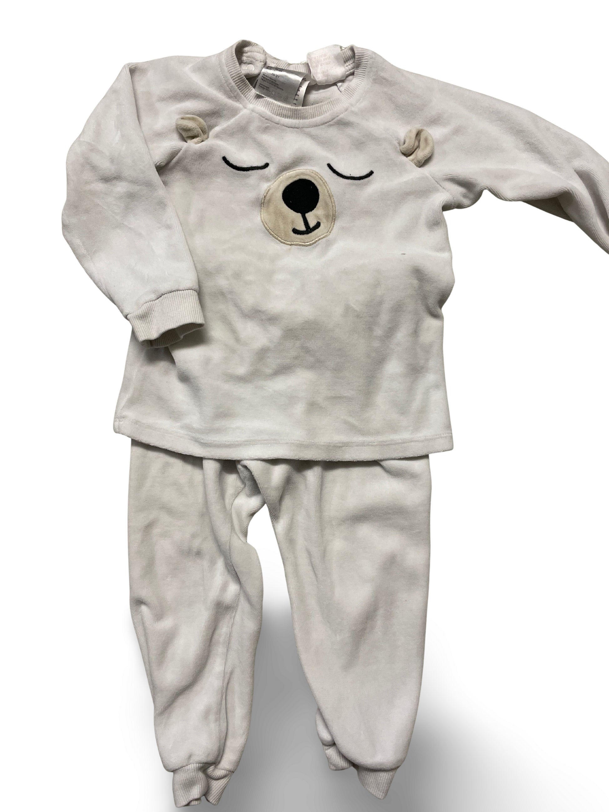 Weisser, zweiteiliger Pyjama mit langärmeligem Oberteil und passender Hose. Auf der Vorderseite ziert ein aufgestickter Bärenkopf mit applizierten Öhrchen, elastische Bündchen an Ärmeln und Hosenbeinen sorgen für guten Sitz. Weiches, kuscheliges Material – ideal zum Schlafen oder für gemütliche Stunden daheim.