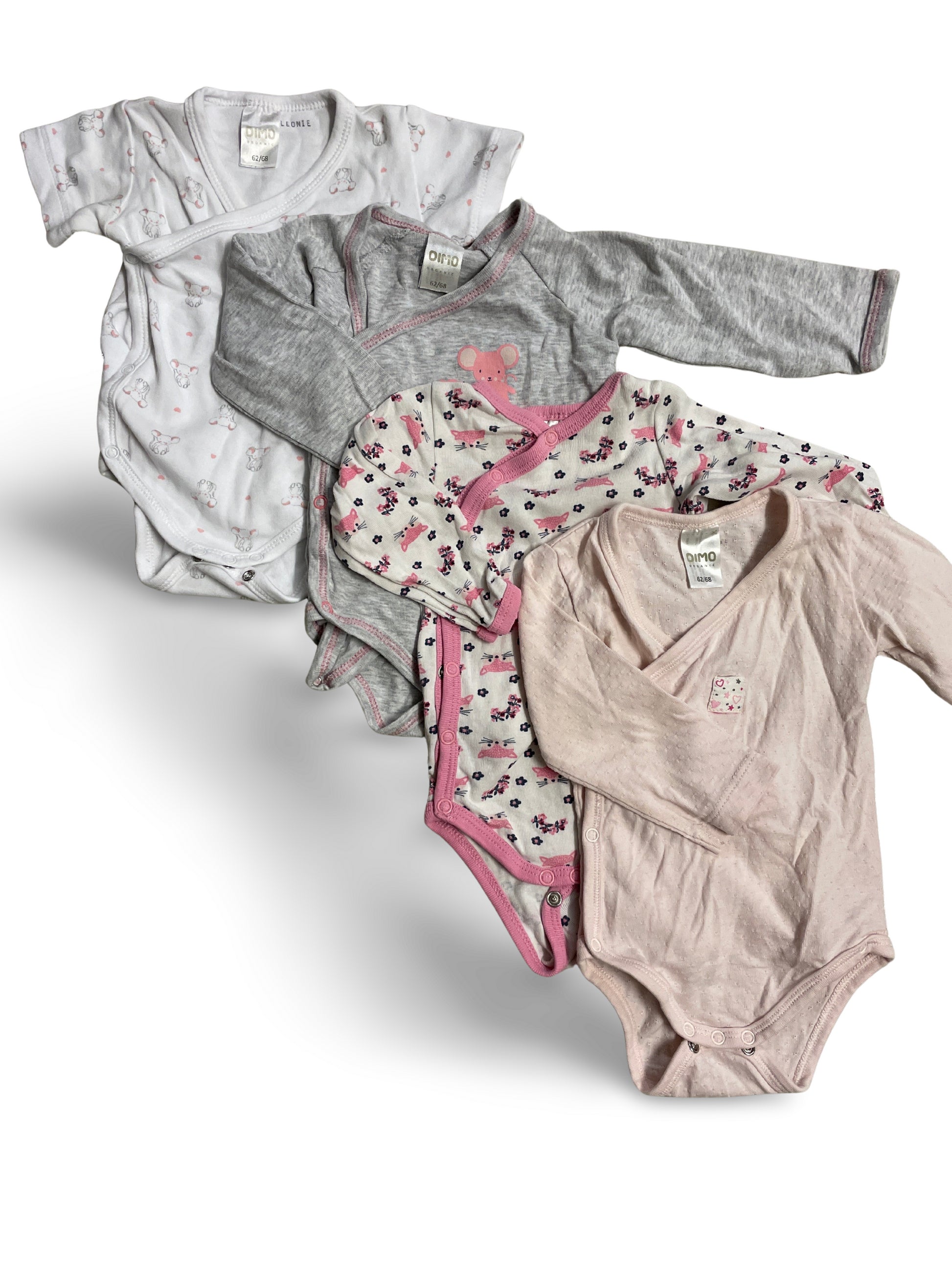 Set mit vier niedlichen Baby-Bodys in zarten Pastellfarben (rosa, grau und weiss) mit verschiedenen Prints wie Mäuschen und Blumen. Mix aus kurz- und langärmeligen Modellen mit praktischen Druckknopf-Verschlüssen — ideal für den Alltag.