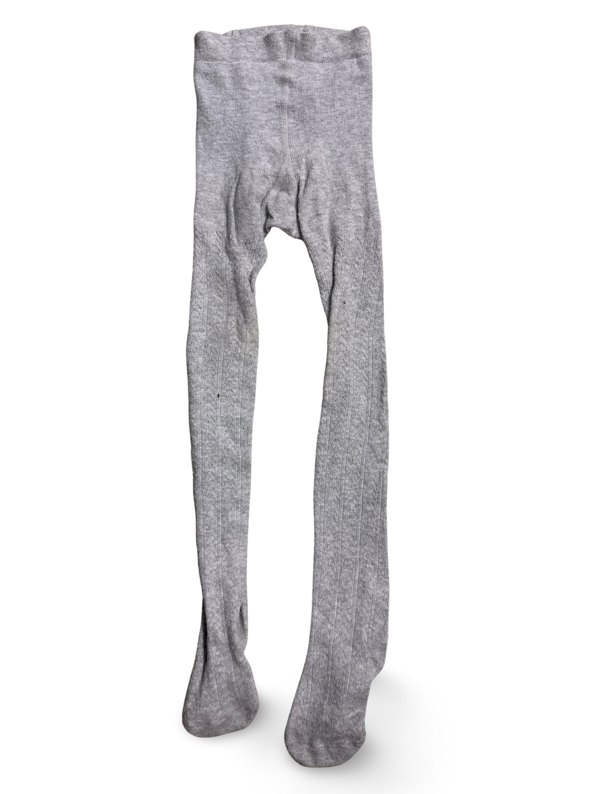 Graue, fein gerippte Strumpfhose mit integrierten Füssen, ideal als wärmende Lage an kühlen Tagen. Der elastische Bund sorgt für angenehmen Halt und lässt sich vielseitig zu verschiedenen Looks kombinieren.