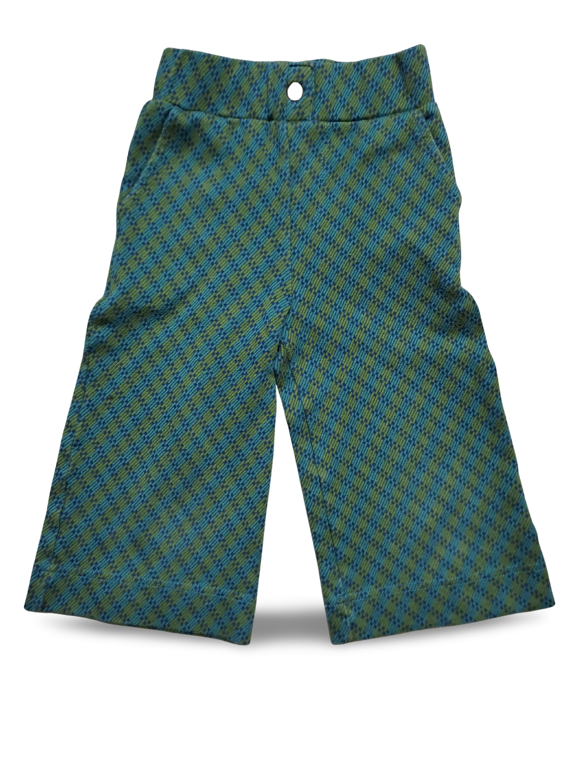 Retro-inspirierte Hose mit auffälligem diagonalen Karomuster in Blau und Grün. Bund mit Knopfverschluss und seitlichen Eingrifftaschen – perfekt für lässige, farbenfrohe Outfits.