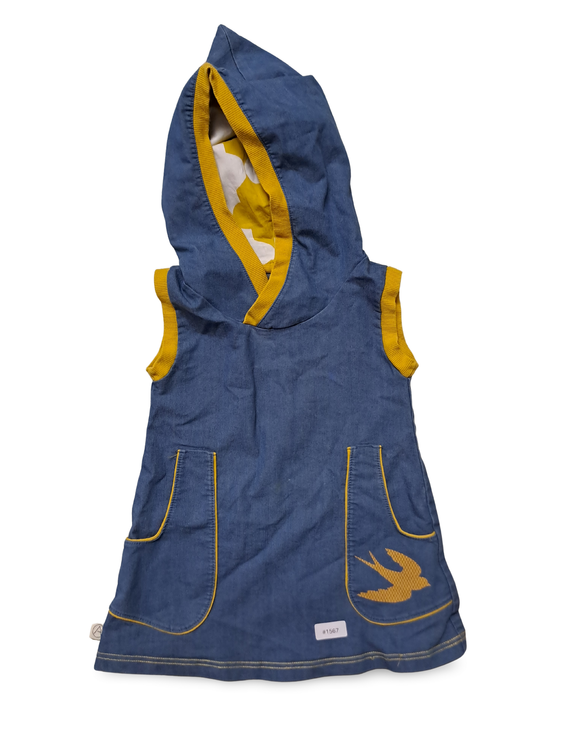 Ärmelloses Kinderkleid mit Kapuze, aus blauem Stoff mit gelben Paspeln, gefütterter Kapuze mit Blautönen im Innenfutter, zwei aufgesetzte Taschen und Vogelapplikation