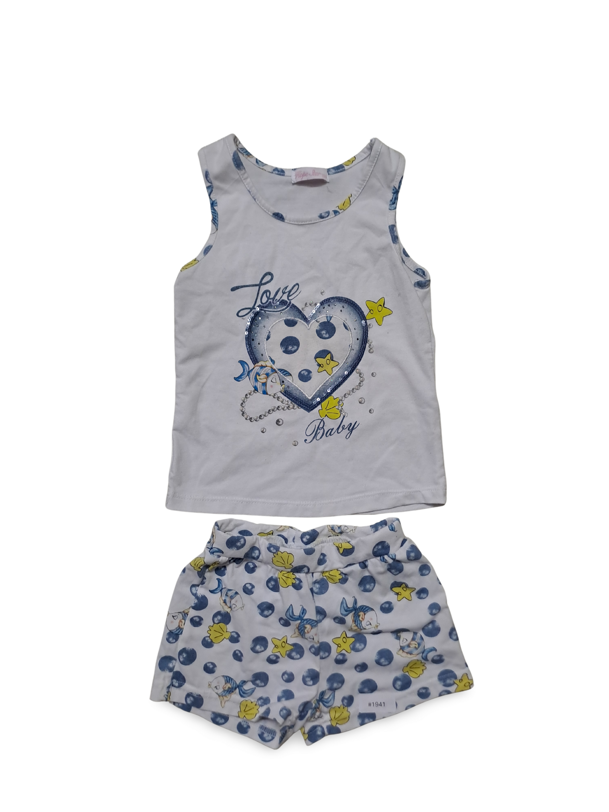 Ein bezauberndes, sommerliches Set fuer kleine Entdeckerinnen: ein weisses Top mit herzlichem "Love Baby"-Motiv und passende Shorts mit verspieltem Fisch- und Sternchenmuster. Leichte Baumwollqualität bietet angenehmen Tragekomfort und sorgt für sonnige, fröhliche Tage.