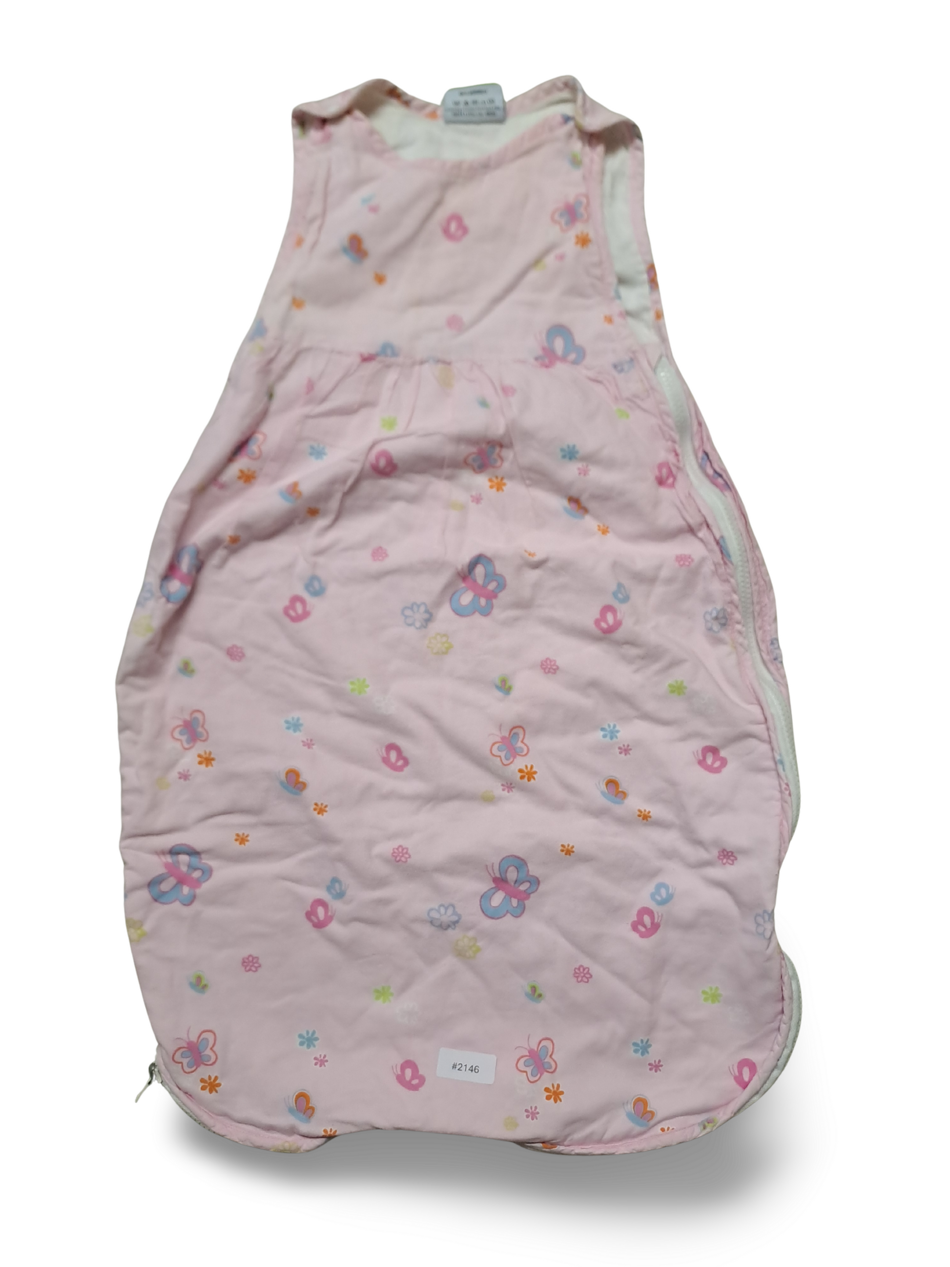 Zarter rosa Babyschlafsack mit fröhlichem Schmetterlingsmuster, weicher Baumwollstoff und liebevollen Details, perfekt für kuschelige Nächte und ruhige Stunden.