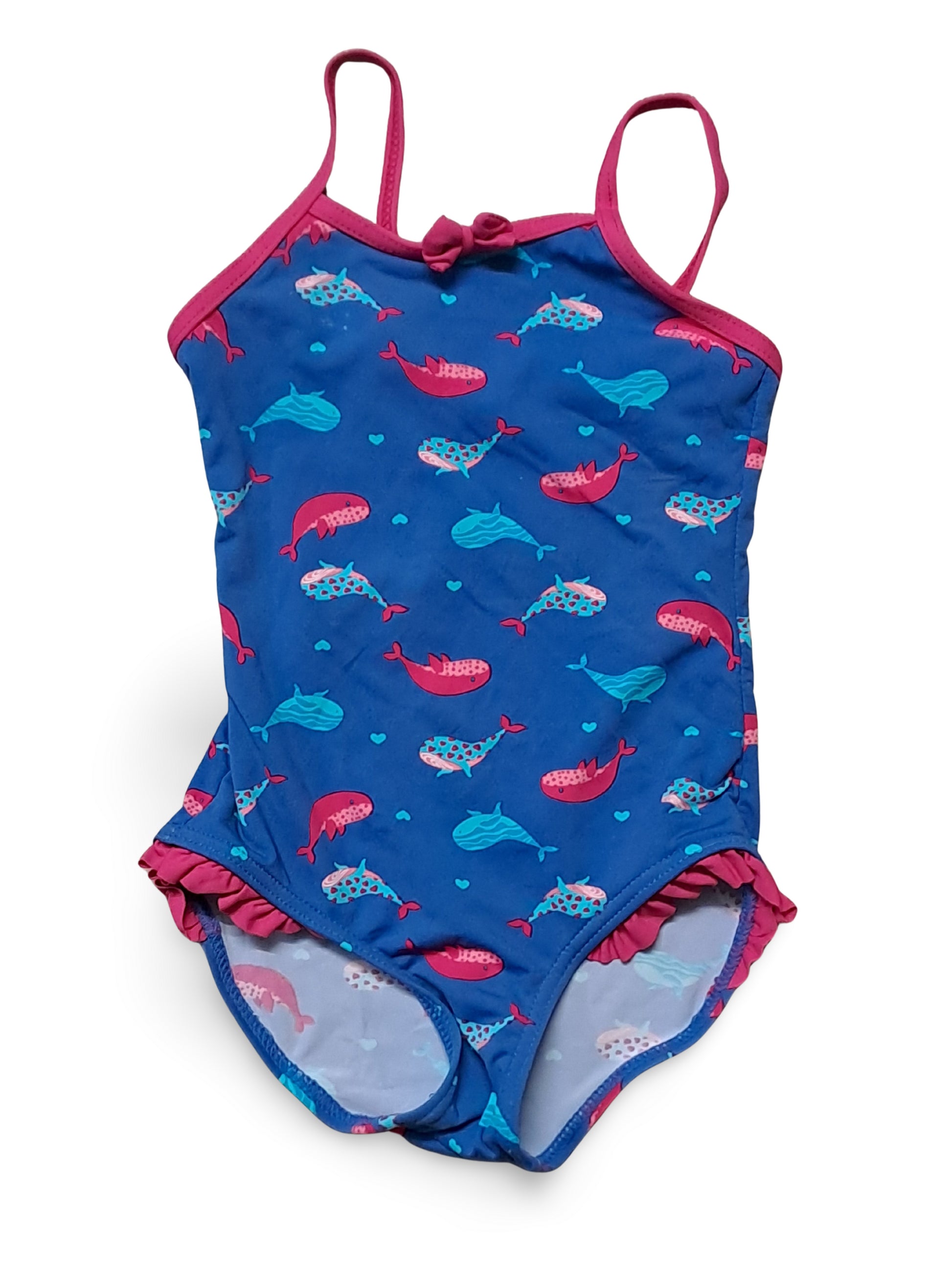 Knallig-blauer Badeanzug für Mädchen mit fröhlichem Walmuster und pinker Einfassung. Feine Spaghettiträger, kleine Schleife am Dekolleté und Rüschchen an den Beinausschnitten runden das verspielte Design ab.