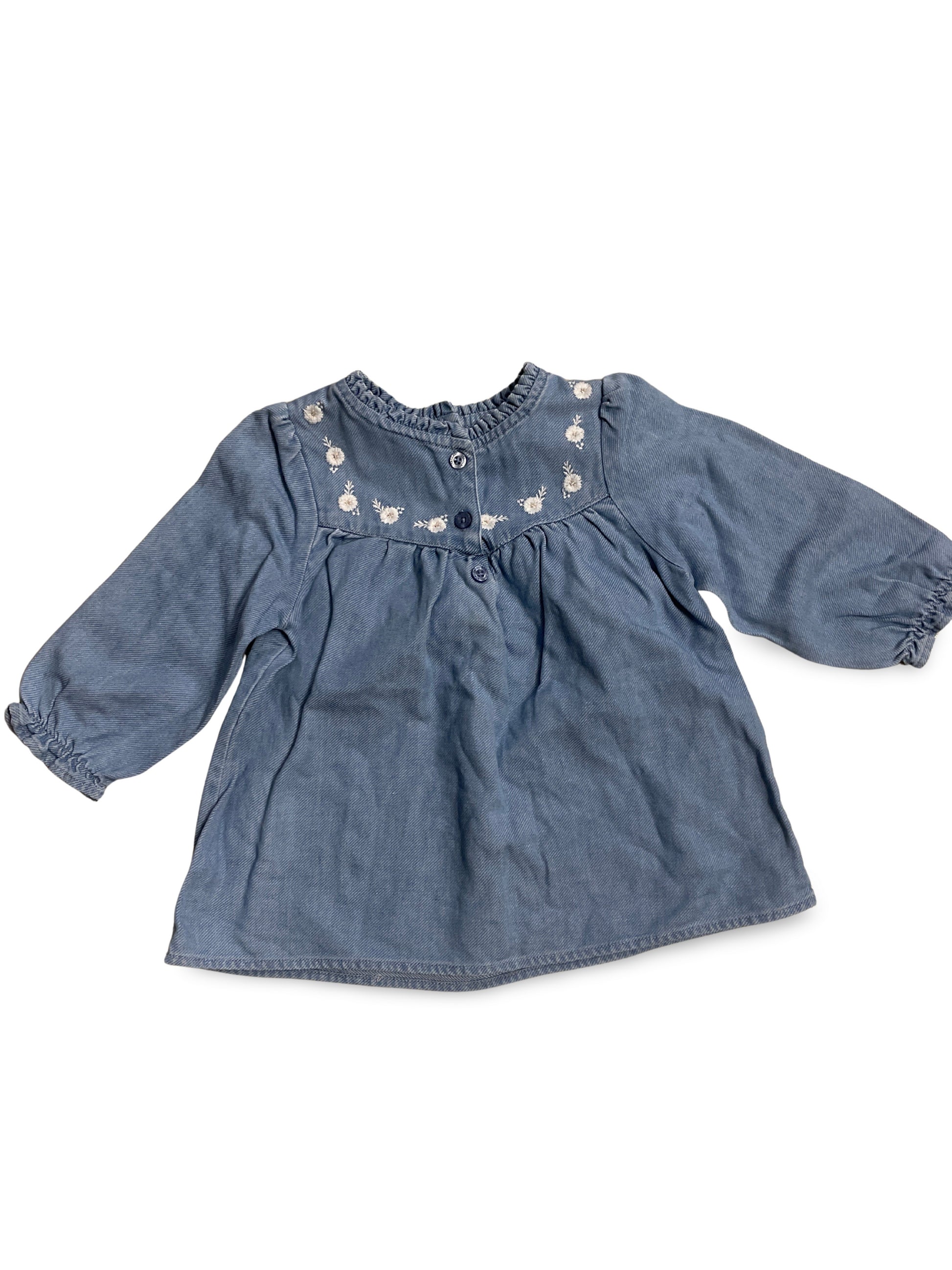 Leichtes, denim-blaues Kleidchen/Bluse mit langen Ärmeln und ausgestellter Silhouette. Zierliche weisse Blumenstickerei entlang des runden Ausschnitts und dezente Knopfleiste vorn setzen feminine Akzente. Elastische Ärmelbündchen und geraffter Einsatz am Brustbereich runden das Design ab.