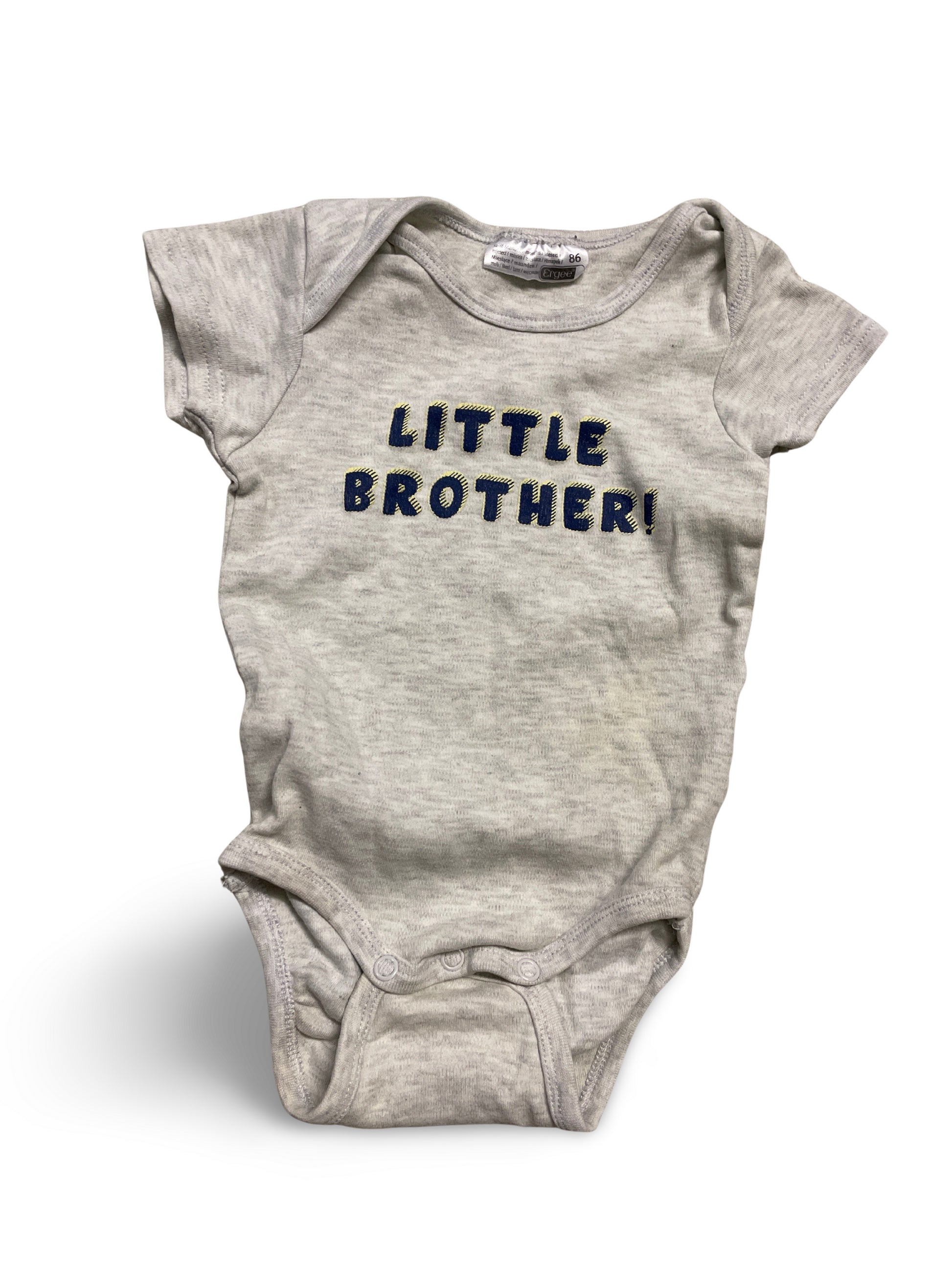 Hellgrauer Baby-Body mit auffälligem "LITTLE BROTHER!" Schriftzug in Blau — ein charmantes Basic für jeden Tag. Mit überlappendem Halsausschnitt und Druckknöpfen im Schritt für einfaches An- und Ausziehen.