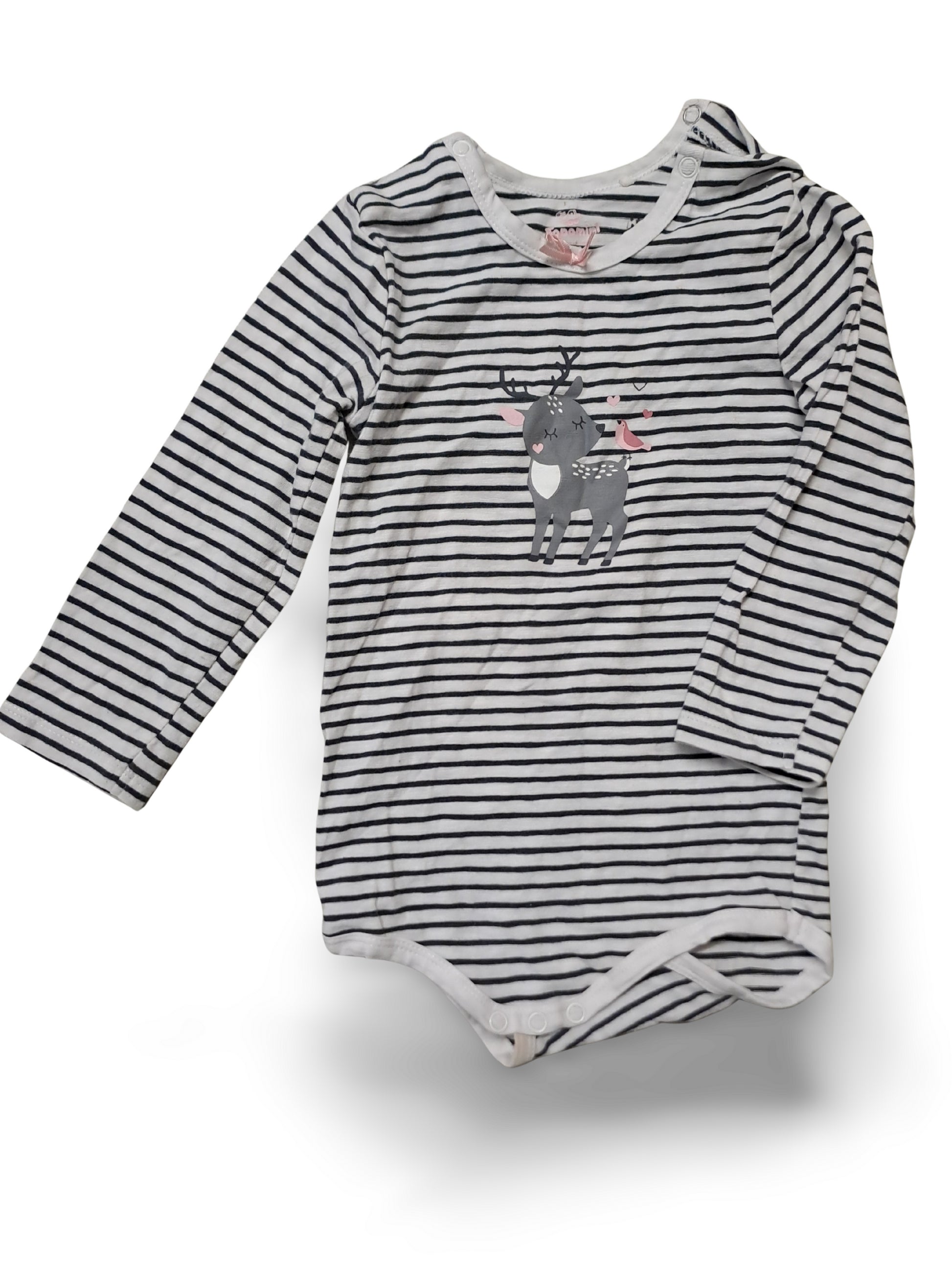 Langarm-Babybody mit klassischem Schwarz-Weiss-Streifenmuster und süssem Reh-Print mit kleinen Vögeln. Mit Druckknöpfen an Schulter und im Schritt für einfaches An- und Ausziehen. Ein vielseitiges Basic fürs Baby-Alltagsoutfit.