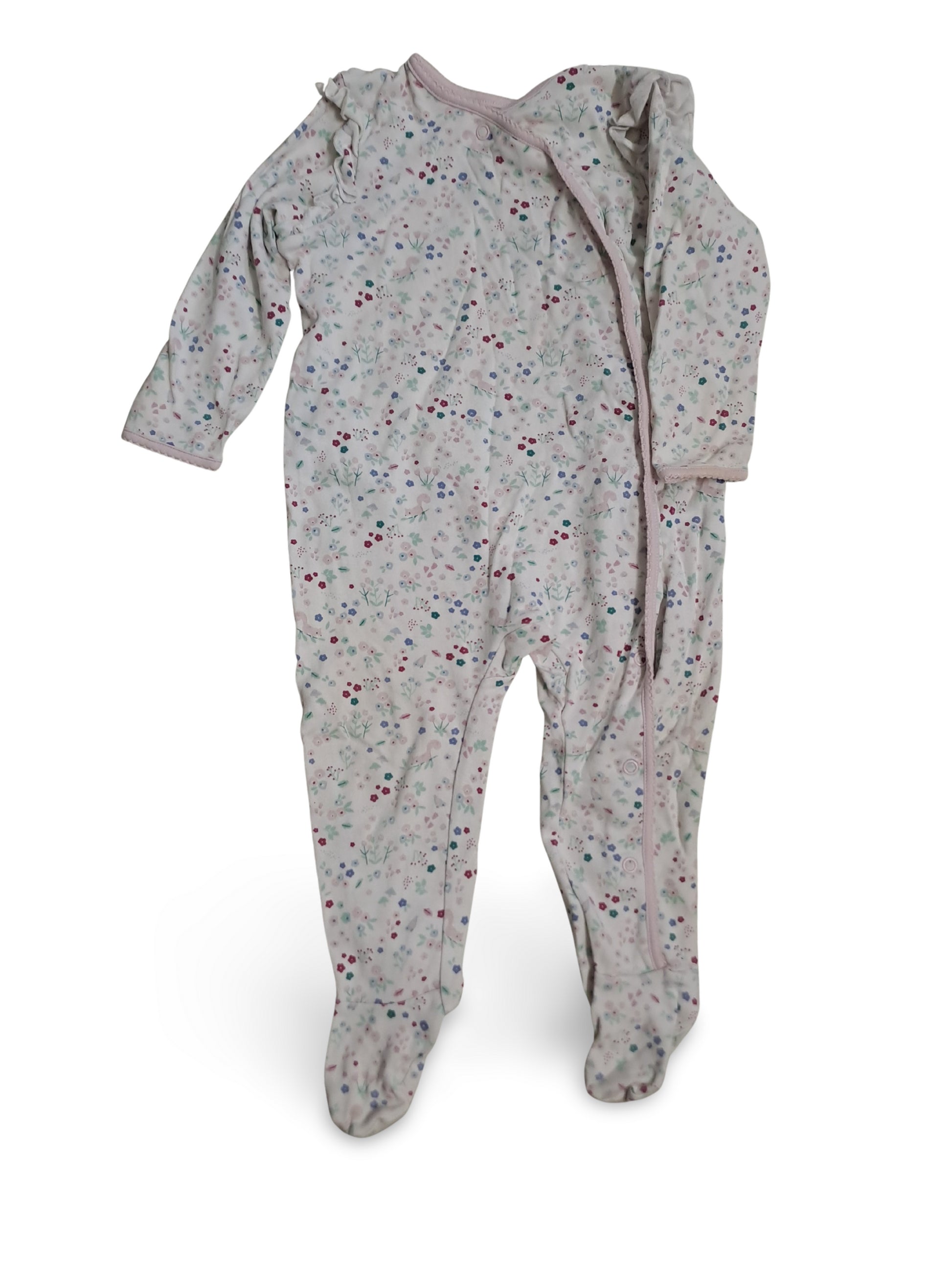 Zarter Baby-Strampler in hellem Rosa mit kleinem, mehrfarbigem Blumenmuster und verspielten Rüschen an den Schultern. Der durchgehende Reissverschluss erleichtert das An- und Ausziehen und die integrierten Füsschen halten warm.
