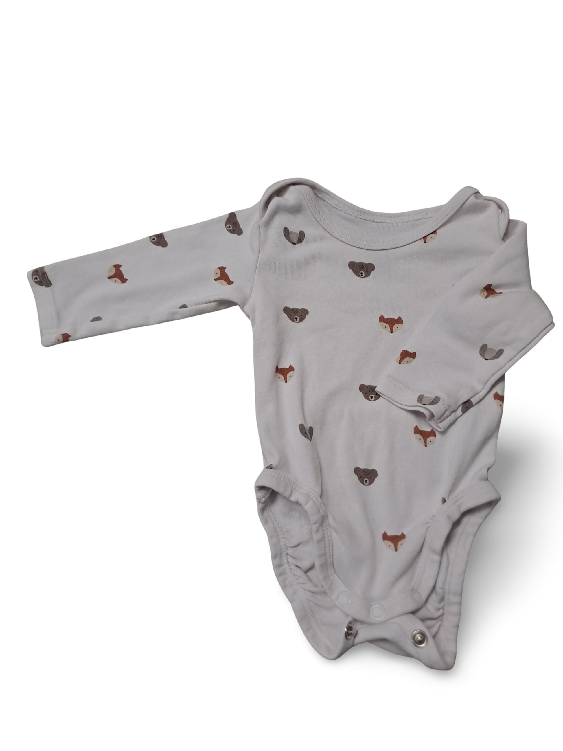 Weisser Langarm-Body mit süssem Waldtier-Print (Fuchs und Bär) und praktischen Druckknöpfen im Schritt. Schlichtes, unisex Design, ideal zum Kombinieren im Alltag.