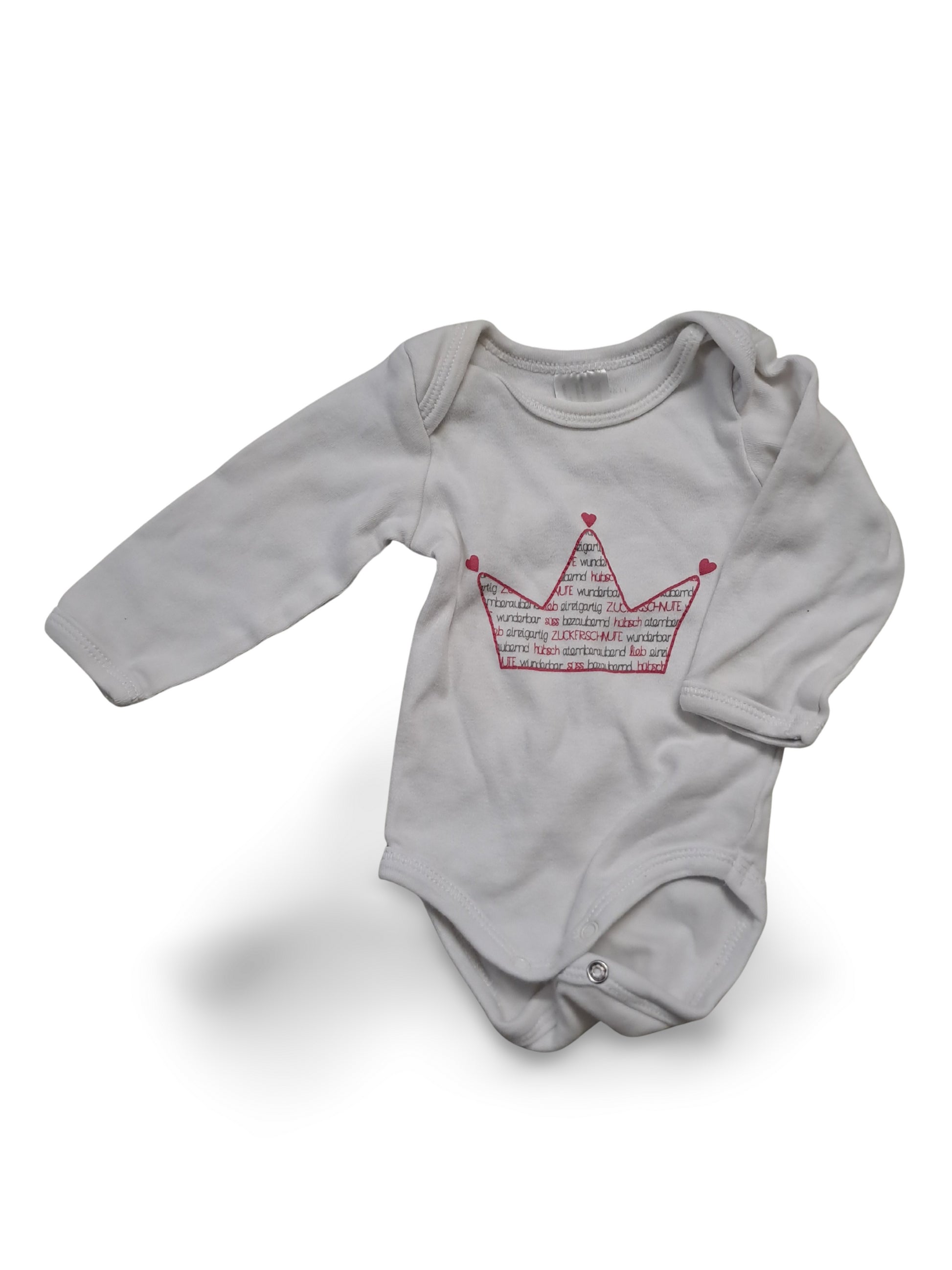 Weisser Langarm-Body mit süssem rosa Kronen- und Herzchenmotiv auf der Vorderseite. Mit praktischem Druckknopf-Verschluss im Schritt — ideal für einfache Handhabung beim An- und Ausziehen.