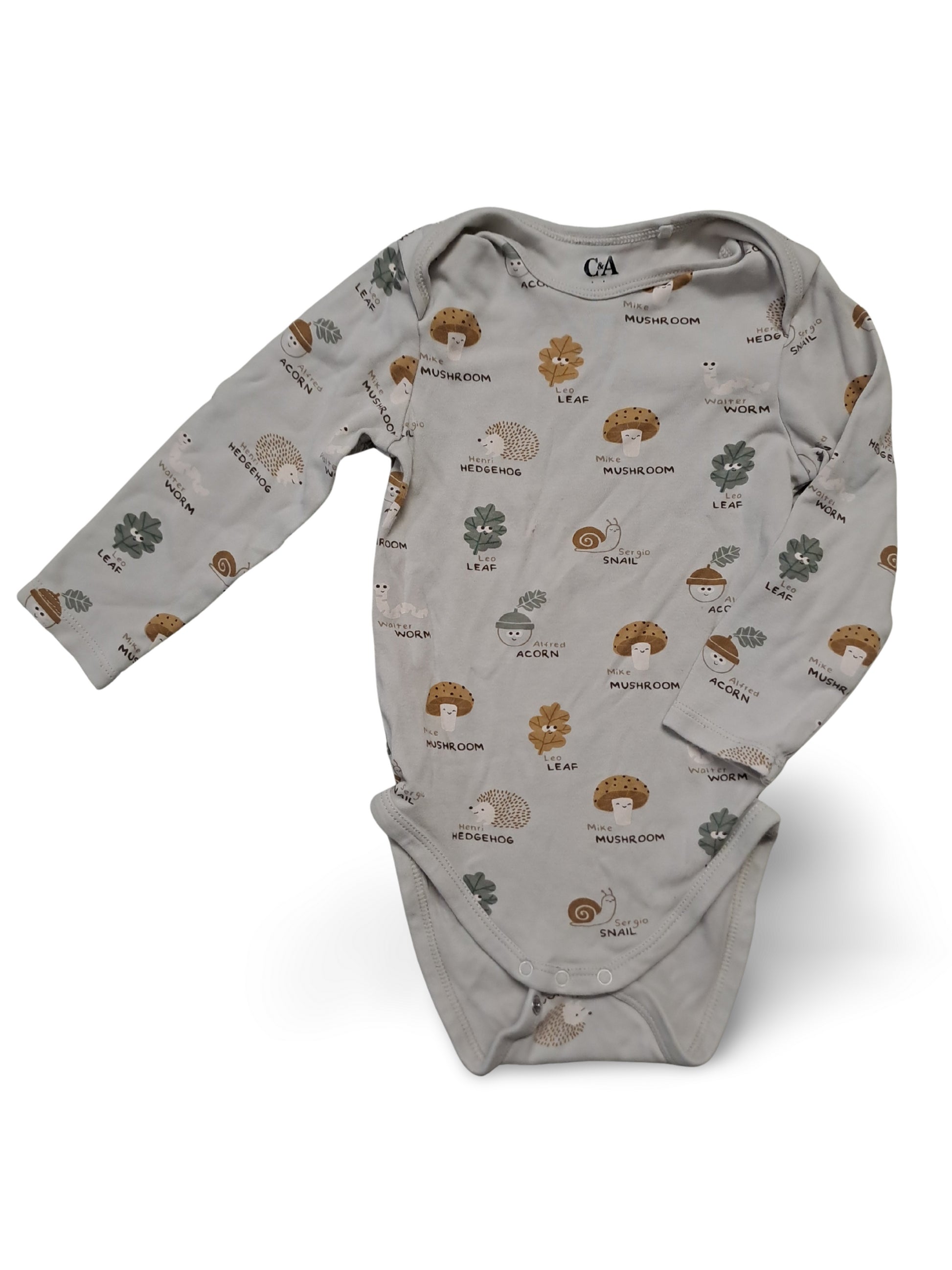 Langarm-Body in hellgrau mit süssem Waldtier-Print (Pilze, Igel, Schnecken und Blätter). Mit praktischen Druckknöpfen im Schritt und bequemem Schnitt – ein vielseitiges Basic fürs Baby-Alltagsoutfit.