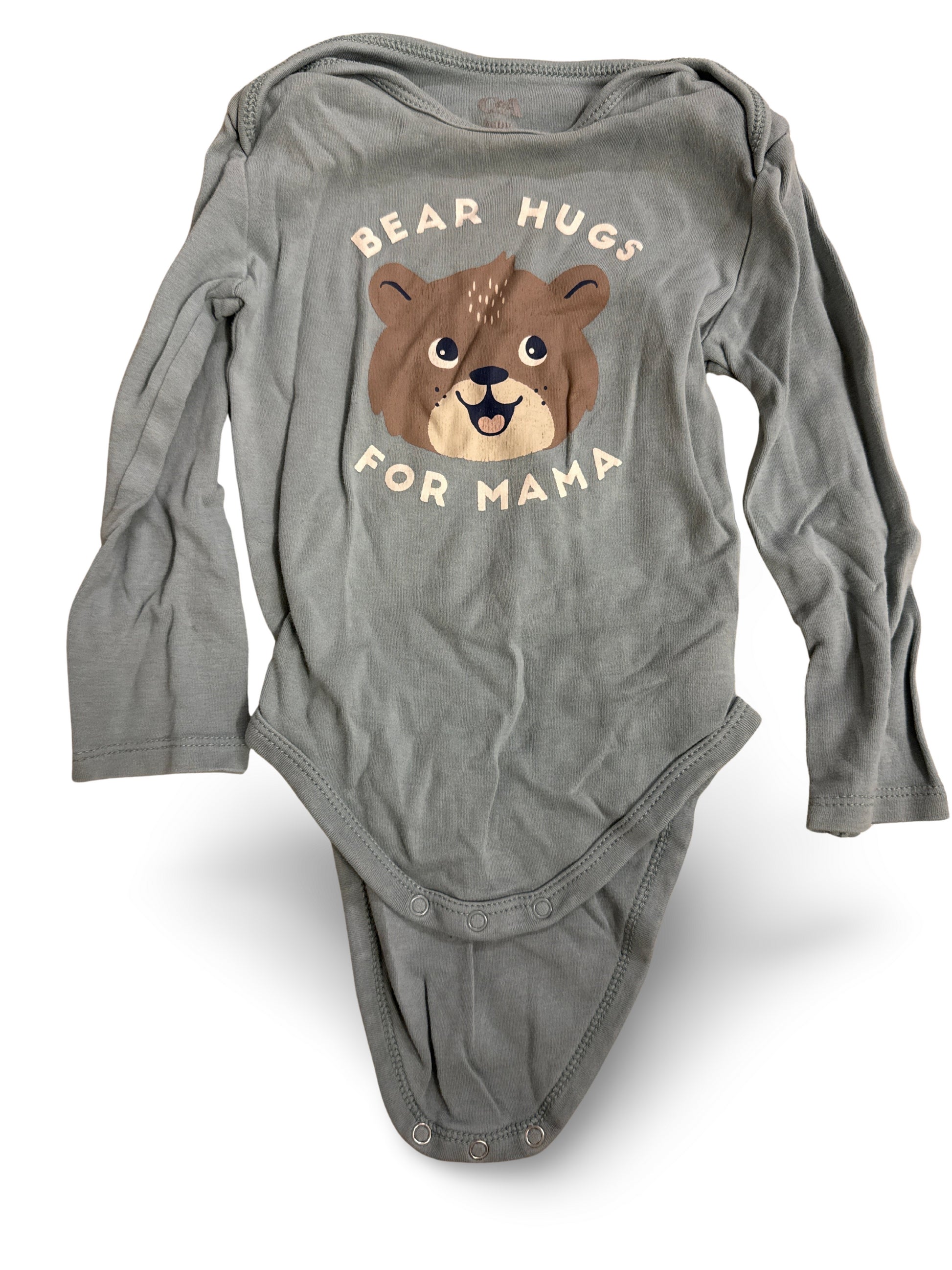 Langarm-Body mit fröhlichem Bärenmotiv und dem Schriftzug "Bear Hugs for Mama". Praktische Druckknöpfe im Schritt sorgen für einfaches An- und Ausziehen sowie bequemes Wickeln.