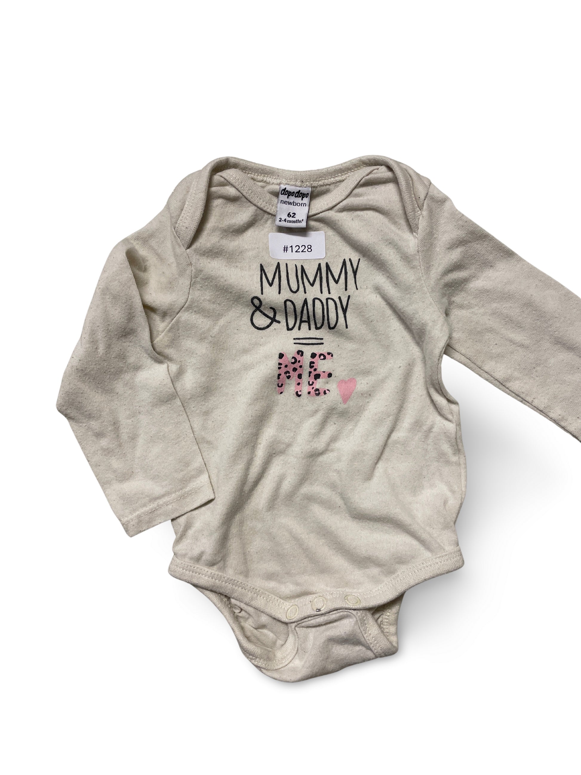 Langarm-Body mit dem Aufdruck 'MUMMY & DADDY ME' in verschiedenen Farben.