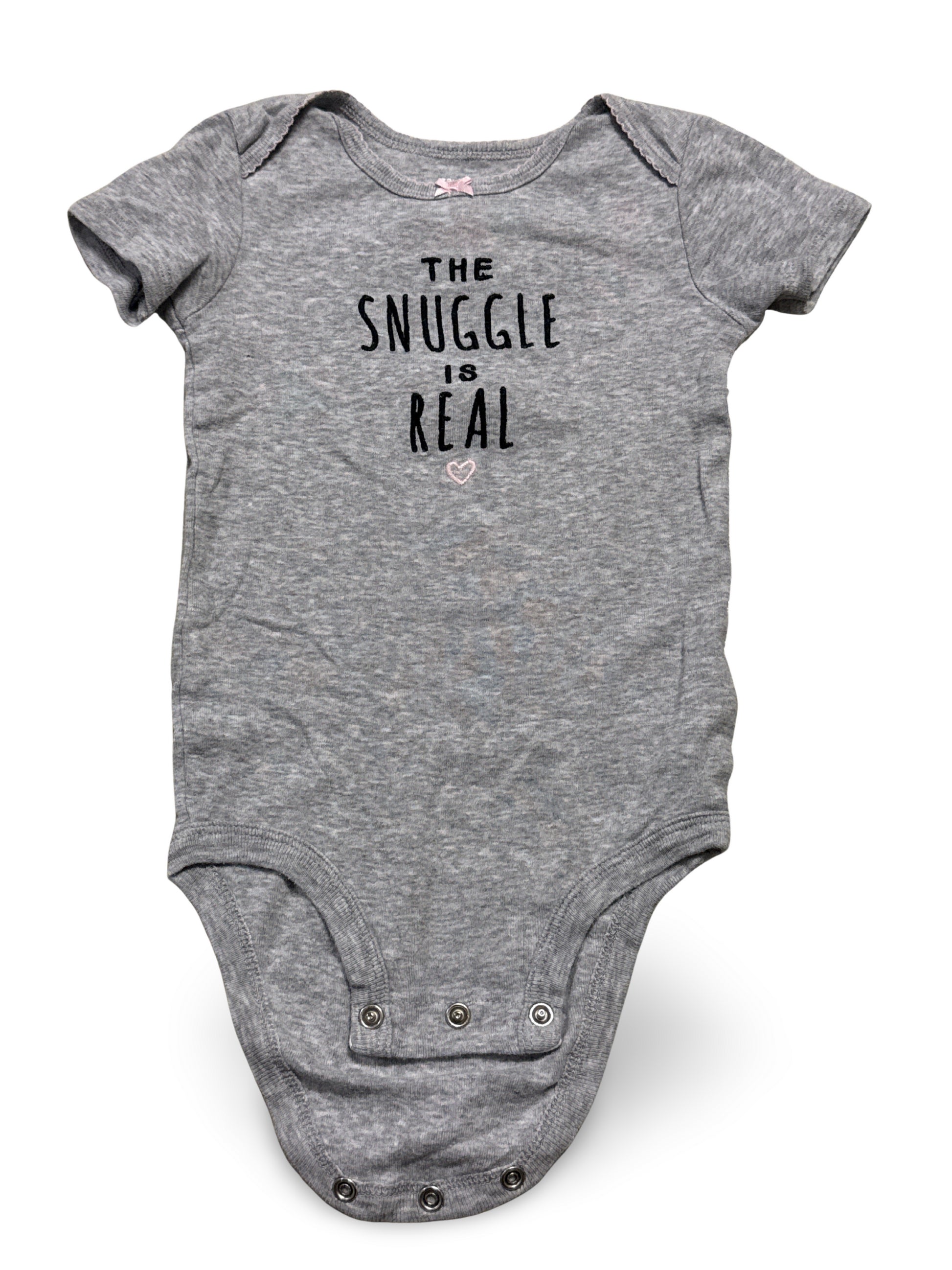 Ein grauer Body mit dem Aufdruck 'THE SNUGGLE IS REAL'.