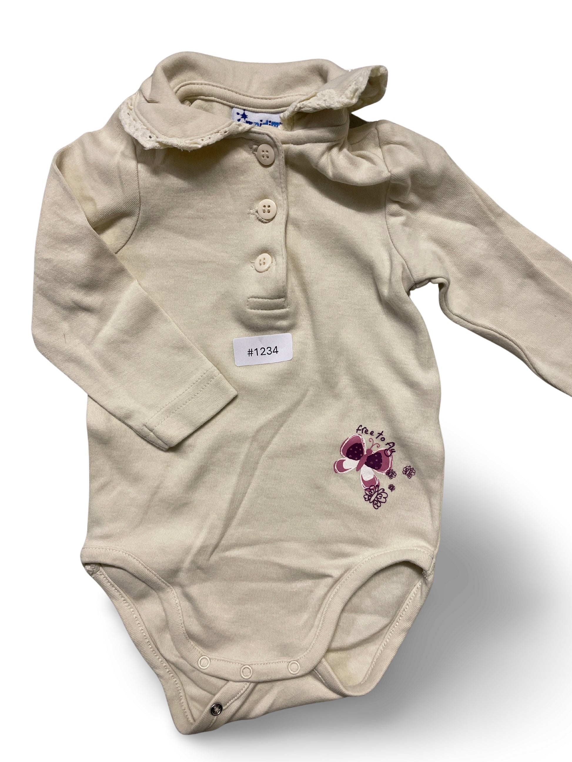 Ein bequemer Body mit Kragen und Knöpfen, verziert mit einem bunten Schmetterlingsmotiv.