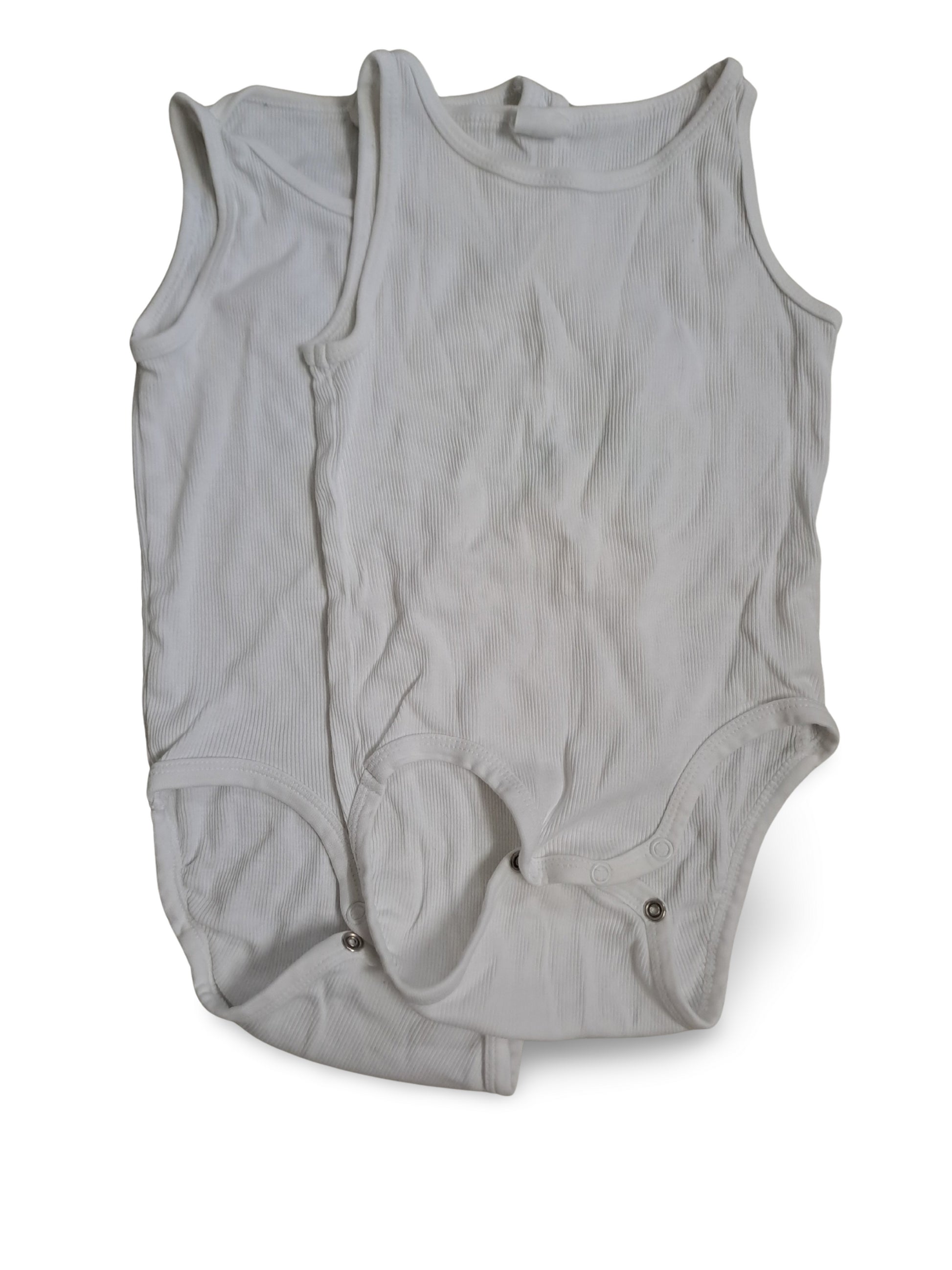 Set mit zwei weissen, ärmellosen Baby-Bodies aus feinem Rippstrick. Mit praktischen Druckknöpfen im Schritt und weichem, dehnbarem Material – perfekt als Unterwäsche oder leichtes Sommertop.