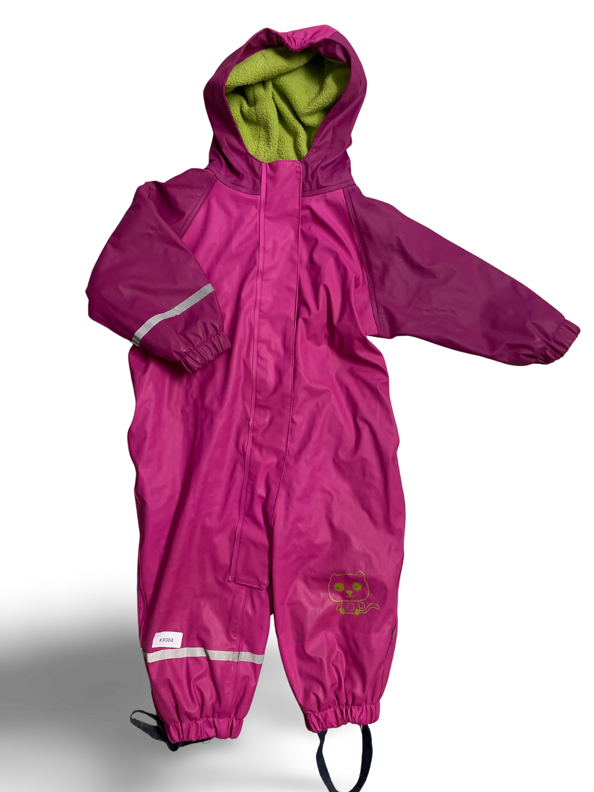 Warmer, wasserdichter Schneeanzug in leuchtendem Rosa mit weicher, hellgrüner Fleecefütterung. Der Einteiler bietet angenehme Bewegungsfreiheit, elastische Bänder an Ärmeln und Beinabschlüssen sowie reflektierende Streifen für bessere Sichtbarkeit. Das niedliche Katzenmotiv rundet das verspielte Design liebevoll ab.