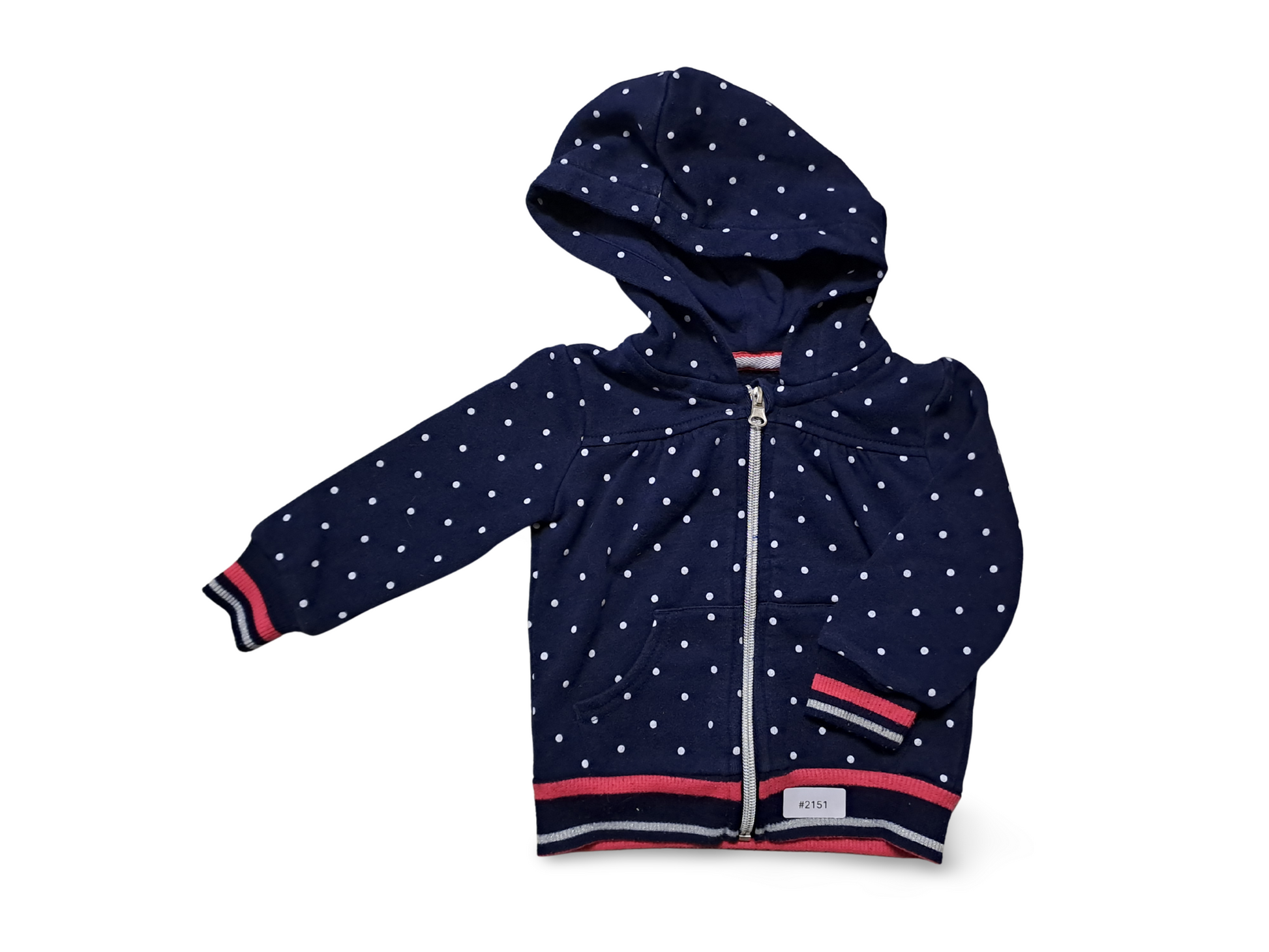 Eine süsse, dunkelblaue Kapuzenjacke mit zarten weissen Pünktchen und kontrastierenden rosa Bündchen. Weicher, anschmiegsamer Schnitt mit praktischem Reissverschluss und kleinen Taschen, perfekt für kuschelige Alltagsabenteuer.