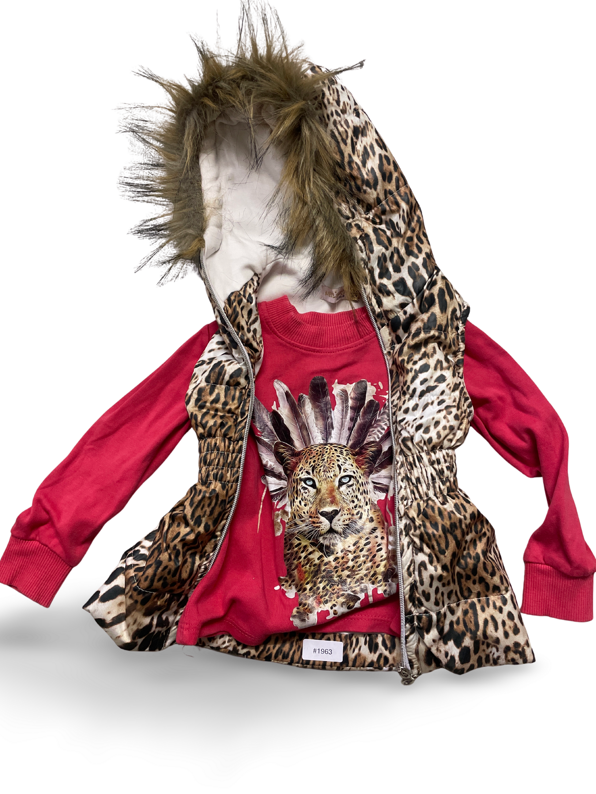 Eine lebhafte, kuschelige Kinderjacke mit Kapuze und flauschigem Kunstfellkragen, verziert mit trendigem Leoprint und kombiniert mit einem warmen roten Sweatshirt. Diese Jacke vermittelt ein gemuetliches Gefuehl und begleitet kleine Entdeckerinnen mit viel Charme.