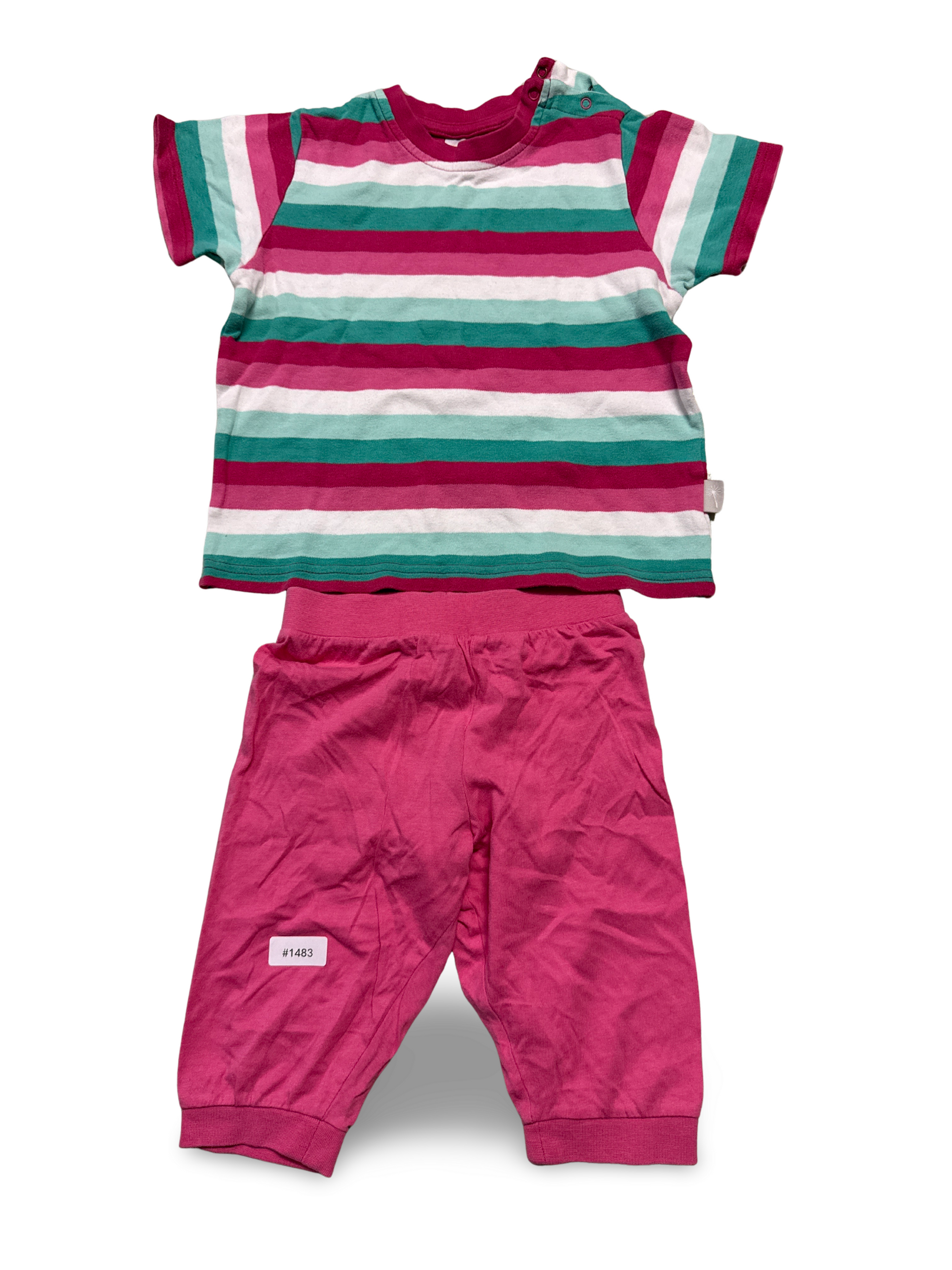 Zweiteiliges Set für Mädchen, bestehend aus Kurzarmshirt mit bunten horizontalen Streifen in Rosa, Weiss und Grün und einer passenden rosa Hose mit elastischem Bund und Bündchen an den Beinen. Schönes, vielseitiges Design.